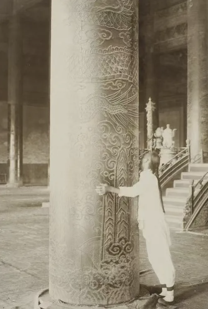 1900年,抱着太和殿金柱的中国人,小川一真摄。