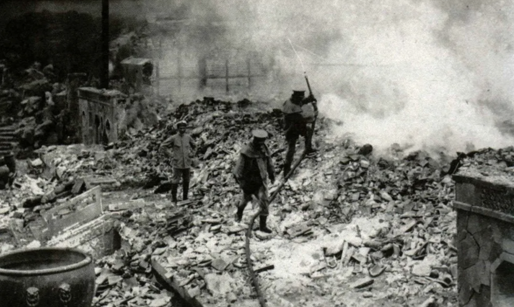 消防员扑救建福宫大火时的情景,此时建福宫已经化为一片焦土。