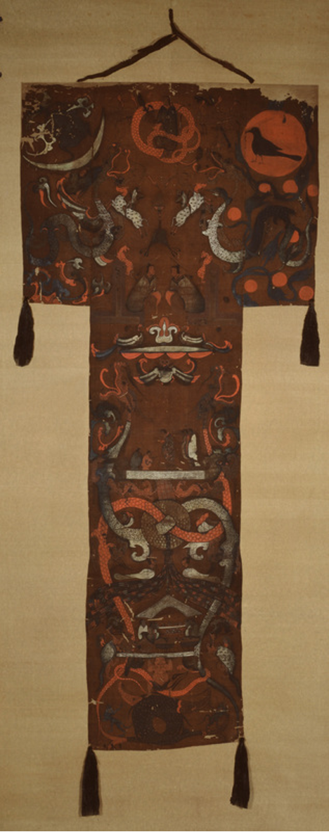湖南长沙马王堆一号汉墓出土的西汉T形帛画,现藏于湖南博物馆,其中红色部分的光谱分析确定为朱砂颜料。朱砂颜料附着于植物纤维或者动物纤维的材质上,并不是一个简单的工艺。《周礼·考工记》里记载:“钟氏染羽,以朱湛丹秫,三月而炽之,淳而渍之。”周代的工匠染羽毛,汉代的工匠绘丝帛,都是将朱砂颜料牢固地附着于动植物纤维上。上文的通行解读是:朱砂颗粒和黏性谷物在一起浸泡,高温下三个月,就得到更红艳、更有黏附力的朱红色染料,以之来给鸟的羽毛染色。