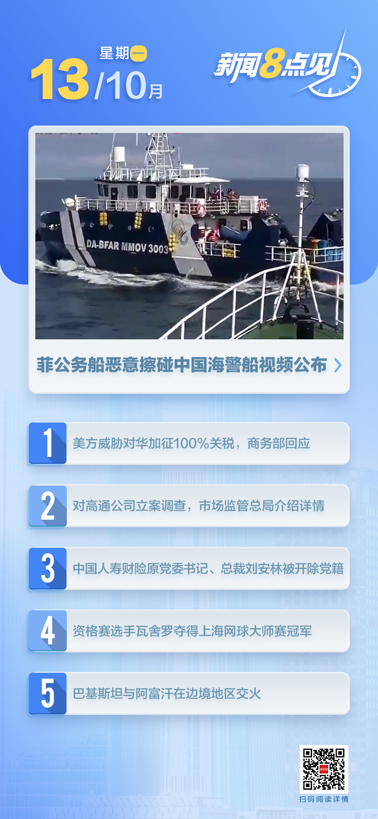 2025年10月12日9时19分,菲3003船无视中方多次严正警告,危险接近中方正常维权执法的海警21559艇,导致发生擦碰。(中国海警)
