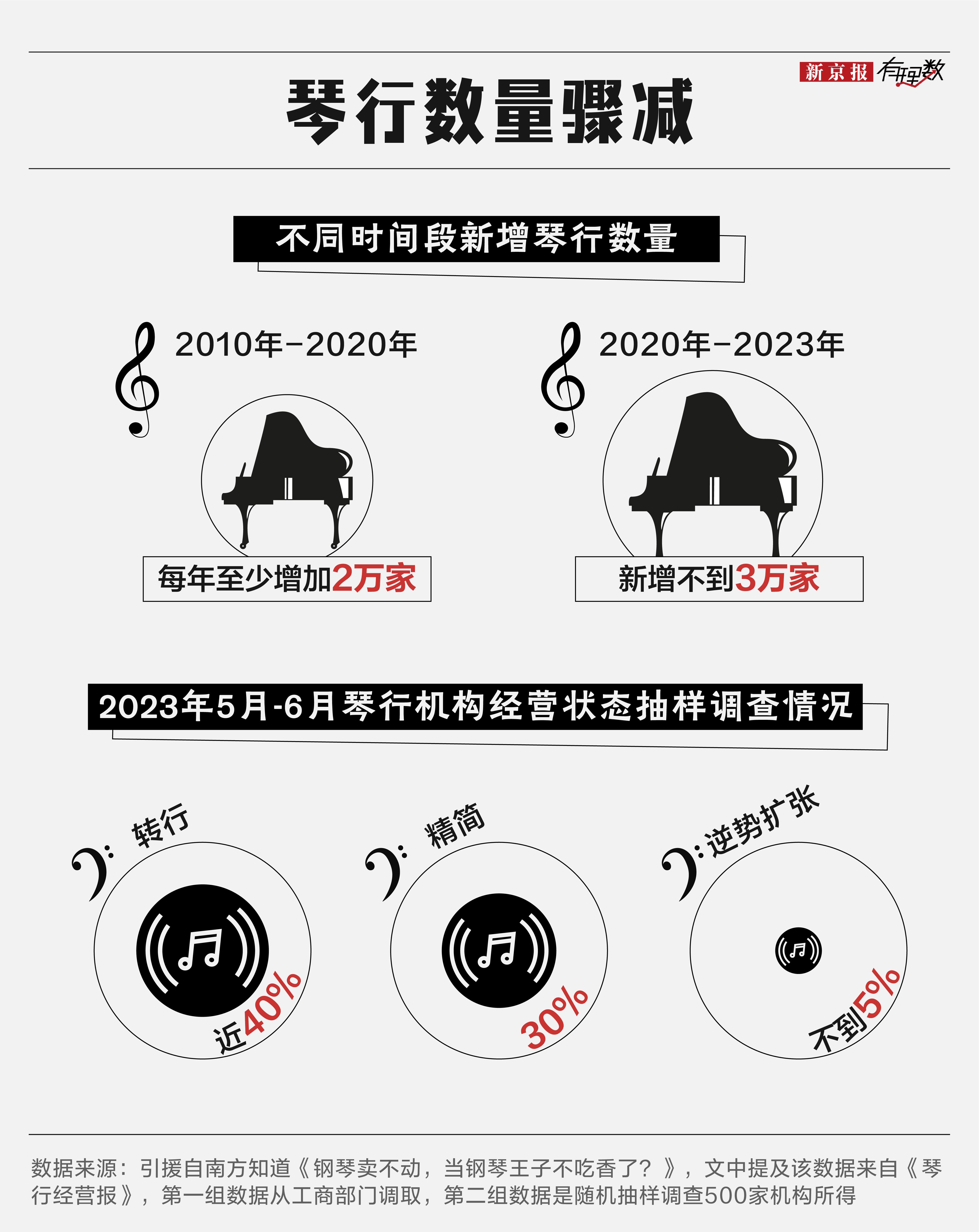 钢琴卖不动了,琴行的生意也不好做。行业数据显示,2020—2023年新增琴行不足3万家,远低于此前年均2万家的增量。