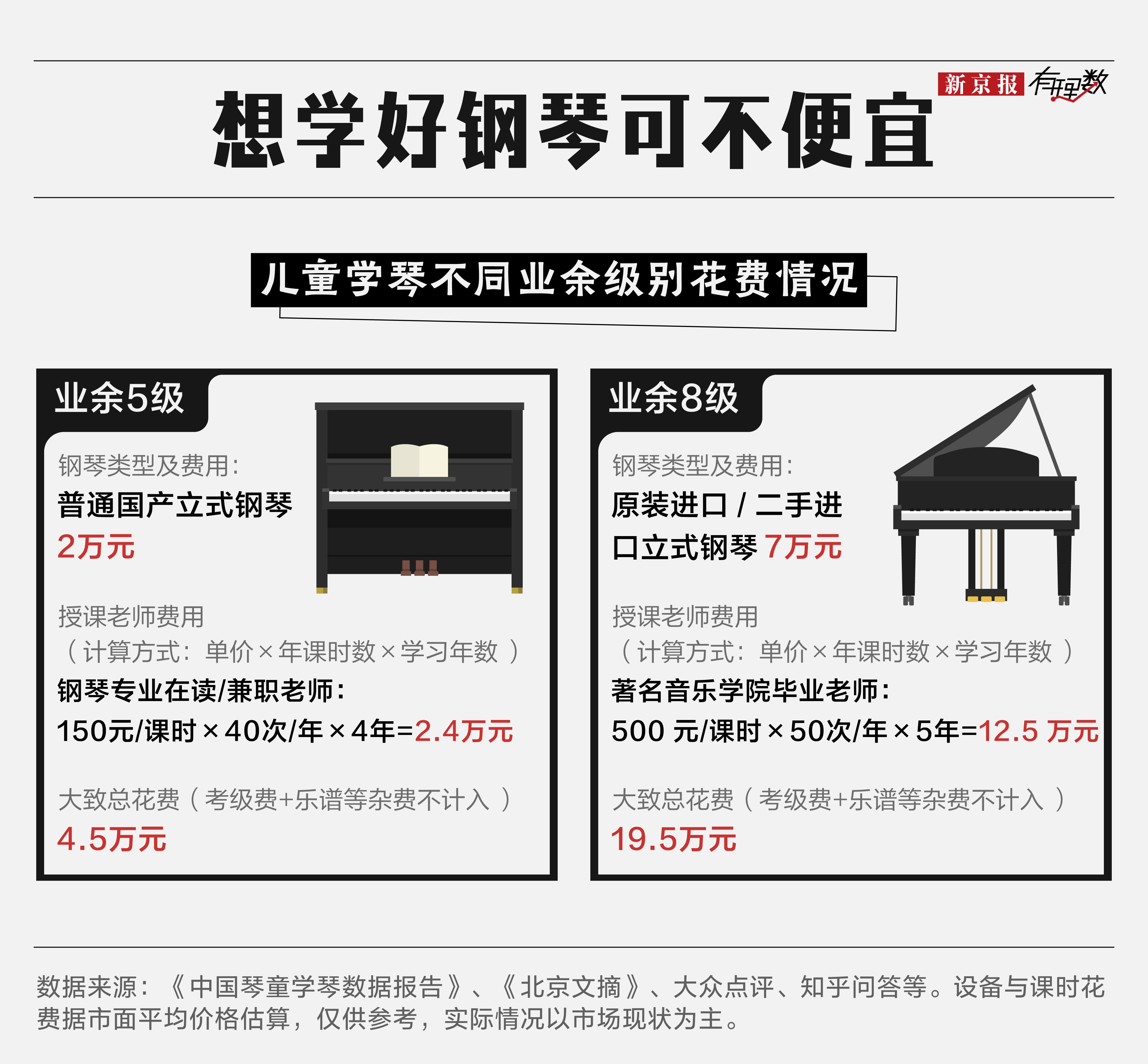 另一方面,学钢琴的成本,也是真的高。相关数据报告显示,想让孩子考业余5级,光买普通国产立式钢琴就得花2万,上课还得每年掏不少钱,普通家庭很难轻松承担。