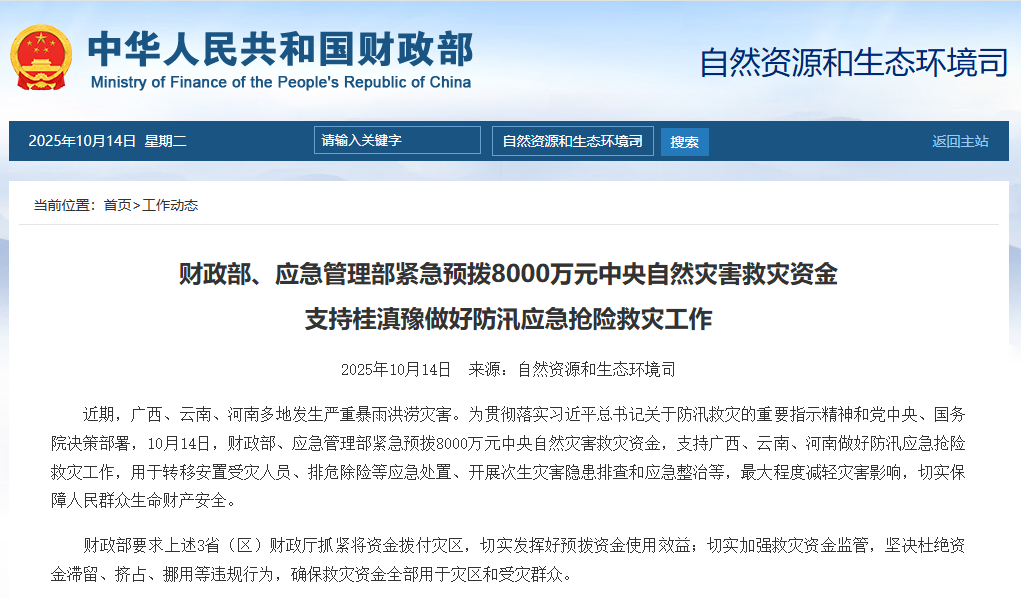 新京报讯 据财政部网站消息,近期,广西、云南、河南多地发生严重暴雨洪涝灾害。为贯彻落实习近平总书记关于防汛救灾的重要指示精神和党中央、国务院决策部署,10月14日,财政部、应急管理部紧急预拨8000万元中央自然灾害救灾资金,支持广西、云南、河南做好防汛应急抢险救灾工作,用于转移安置受灾人员、排危除险等应急处置、开展次生灾害隐患排查和应急整治等,最大程度减轻灾害影响,切实保障人民群众生命财产安全。