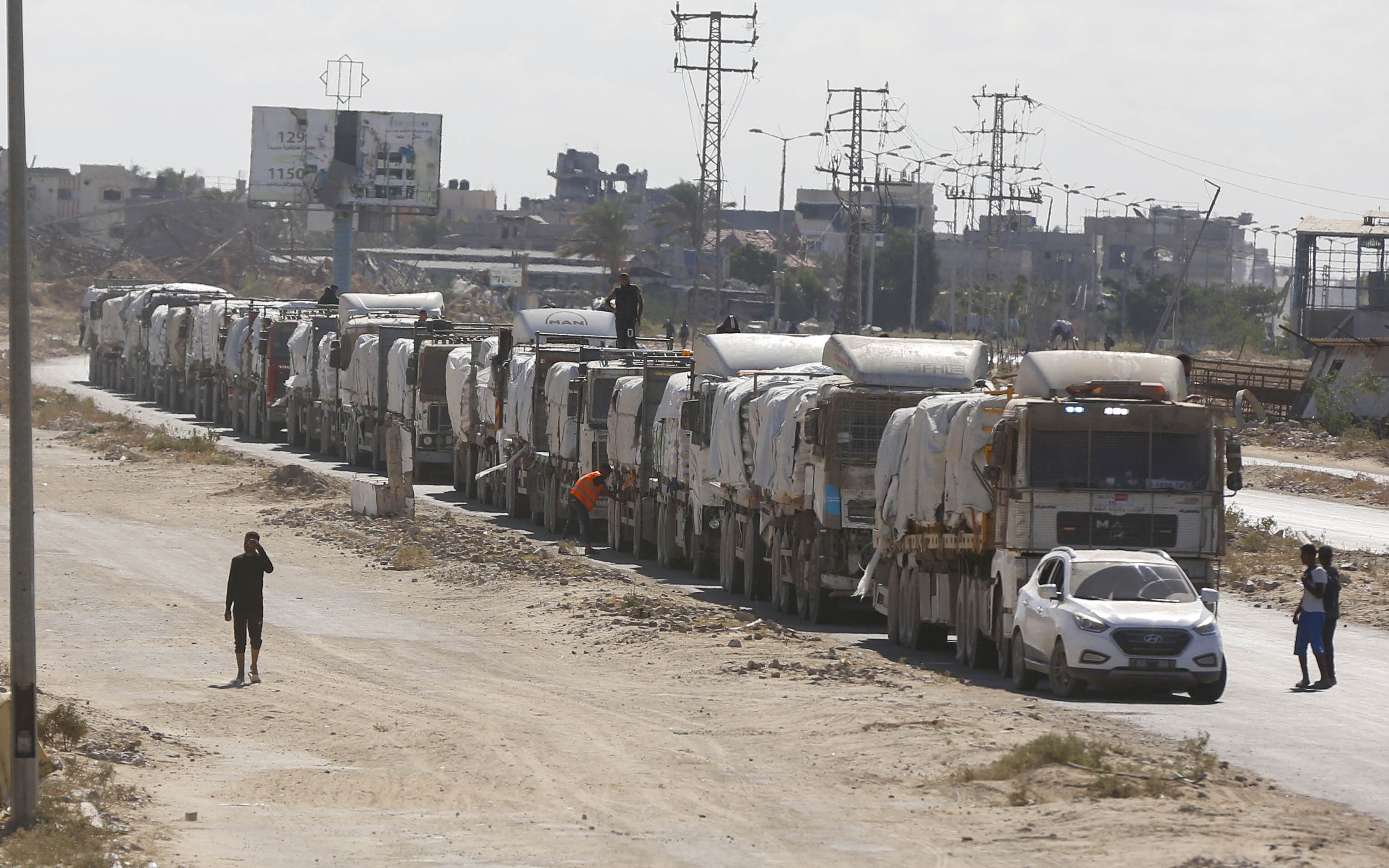 当地时间10月14日,停火协议生效后,载有人道主义救援物资的卡车抵达加沙。