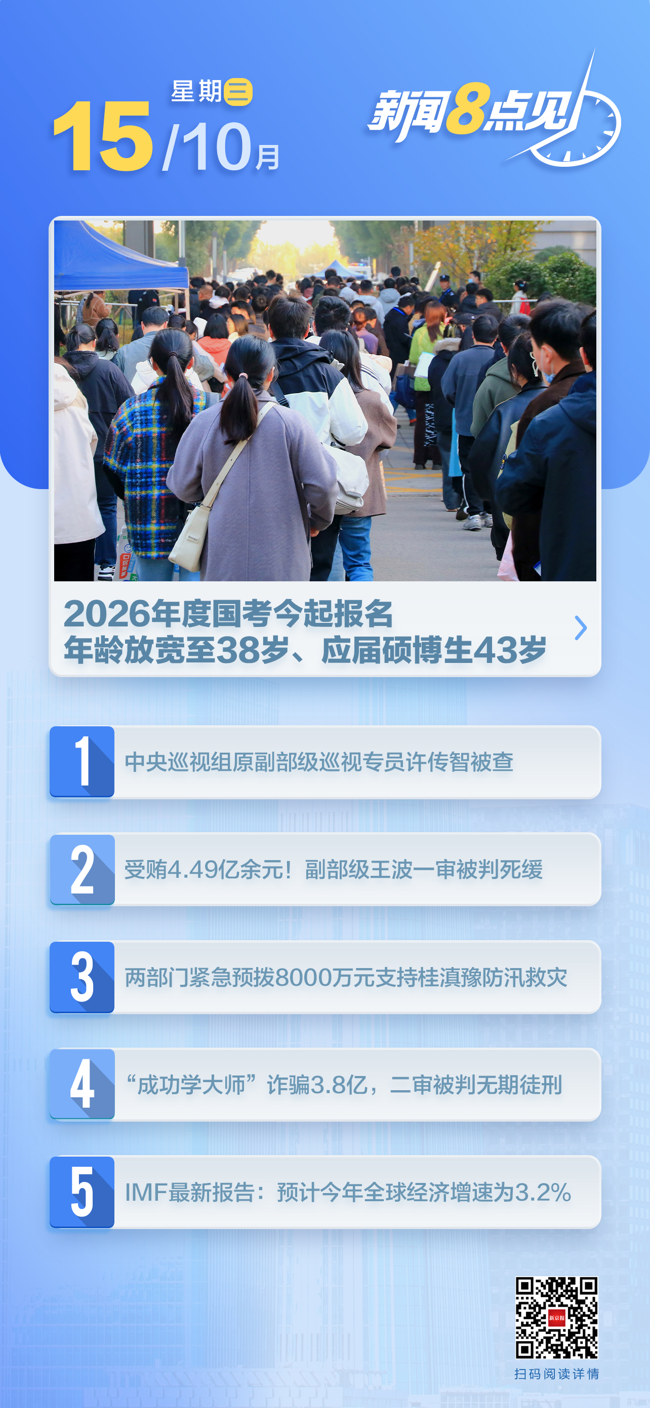 10月14日,中央机关及其直属机构2026年度考试录用公务员公告正式发布。记者注意到,公务员考试对报考者的年龄限制进一步放宽,报考者年龄一般为18周岁以上、38周岁以下(1986年10月至2007年10月期间出生),对于2026年应届硕士、博士研究生,放宽到43周岁以下(1981年10月以后出生)。考生可于10月15日8:00至10月24日18:00期间登录“中央机关及其直属机构2026年度考试录用公务员专题网站”进行网上报名。(新京报)阅读全文>>>