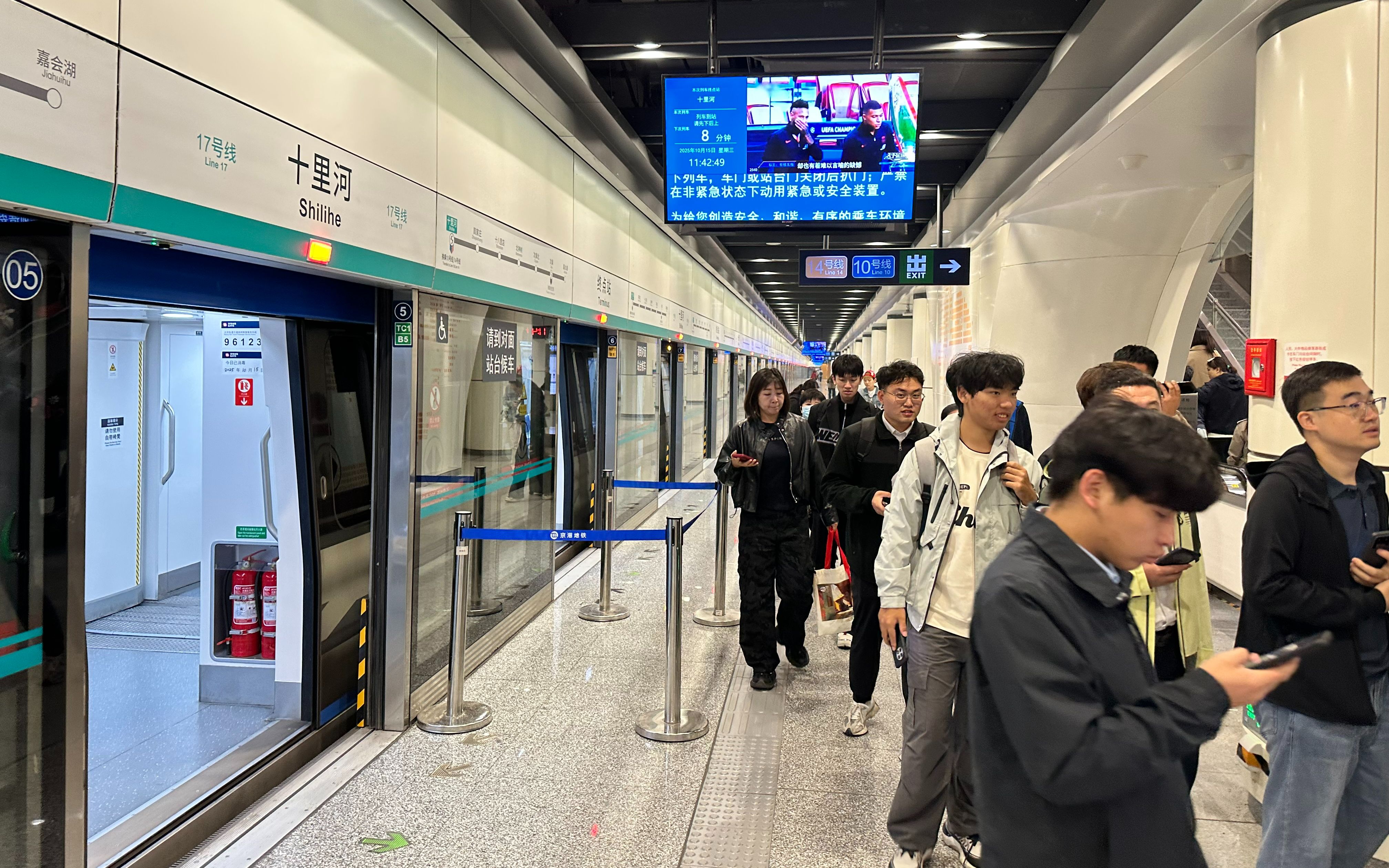 “我到未来科学城应该怎么走,我看这不也是17号线吗?我记得上次就是坐17号线去的呀。”10月15日12时,一名乘客在地铁17号线十里河站的站台上对着线路图犯糊涂。