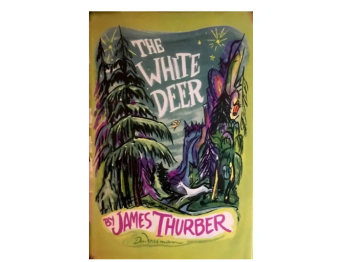 瑟伯的这种幽默解构在他为儿童而作的五个故事里体现得更为明显(上述寓言更多为成年人而作)。1945年,《白鹿》出版,乍一看是传统童话:国王的三个儿子在打猎时遇见了由白鹿变成的公主,他们分别接受公主指派的冒险任务,完成的那位将赢得公主的心。