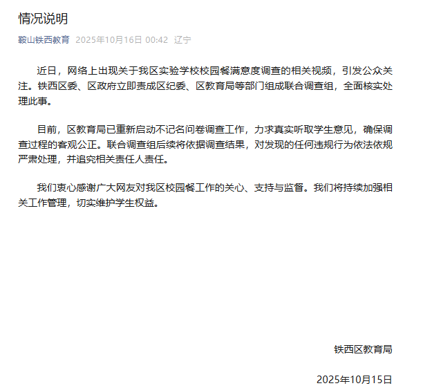 近日,网络上出现关于我区实验学校校园餐满意度调查的相关视频,引发公众关注。铁西区委、区政府立即责成区纪委、区教育局等部门组成联合调查组,全面核实处理此事。