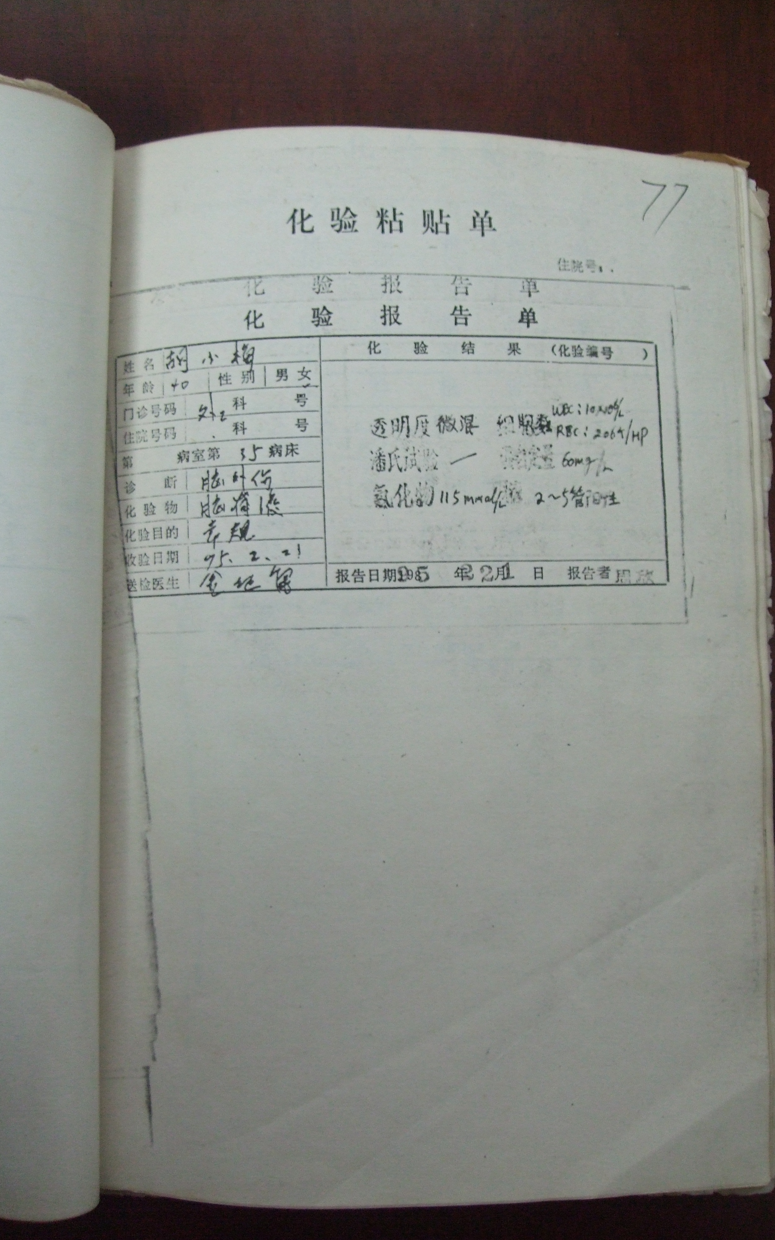 胡小梅在空军医院的化验单,此为重抄件。受访者供图