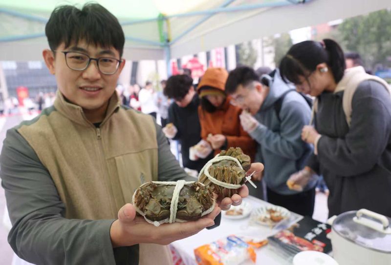 一名从事水产养殖的校友为学弟学妹带来免费试吃大闸蟹的福利。