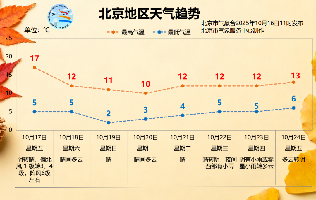 据北京市气象局消息,今天(10月16日)有零星小雨或小雨,最高气温仅在15℃上下,预计夜间为降雨相对明显时段。受强冷空气影响,降雨停歇之后,明天(10月17日)白天3、4级偏北风又会接踵而至,阵风 6 级左右,户外要做好防风措施。