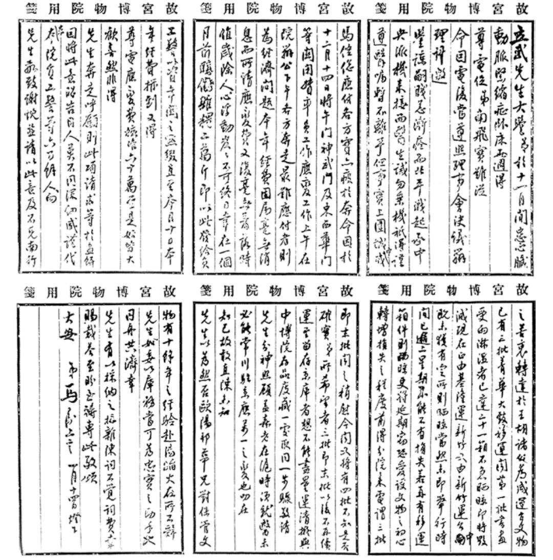 弟于十一月间患心脏动脉紧缩症,卧床两周。得尊电促弟南飞,实难从命。因电复当遵照理事会决议办理。诚邀鉴谅。嗣贱恙渐痊而北平战起,承中央派机来接,而医生诫勿乘机。只得谨遵医嘱,暂不离平。但事实上围城中戎马倥偬,应付各方实亦疲于奔命。因于十二月十四日将午门、神武门及东西华门等关闭,督率员工作应变工作。上午在院办公,下午各方奔走。最难应付者则为经济问题。本年经费固属毫无消息,而所请应变费又复毫无着落。时值岁除人心浮动,岌岌不可终日。幸在一个月前临备杂粮二万斤,即以此发给员工警以资年关之点缀。直至本月十日本年经费拨到,又得尊电应变费核准六十万,至是始皆大欢喜。然非得先生奔走呼吁则此项请求等于画饼。因将此意昭告同人,莫不同深纫感。谨代表本院员工警等六百余人向先生敬致谢忱,并请以此意及不克南行之苦衷转达于王、胡诸公为感。运台文物已有三批菁华大致移运,闻第一批书画受雨淋湿者已达二十一箱,不急晒晾即将毁灭。现存正由基隆运新竹,又由新竹运台中。既未获有定所,则晒晾当然未即举行,时间已逾二星期,几能不有损失。若再有移运箱件则晒晾更将延期。窃恐爱护文物之初心转增损失之程度。前得分院来电谓三批即末批,闻之稍慰。今闻又将有四批不知是否确实。弟所希望者三批即末批,以后不再续运。其留存京库者想不能尽量运清,拟与中博院存品庋藏一处,取同一步骤。敬请先生分神照顾。盖森老在沪时须就医,未必能常川驻京应万一之变也。叨在知己故敢直陈,未知先生以为然否?欧阳邦华兄对保管文物有十余年之经验,赴汤蹈火在所不辞,先生如委以库务当可为忠实之助手也。同舟共济幸先生有以采纳之。拉杂陈词不觉词费,幸赐裁答,至盼至祷。