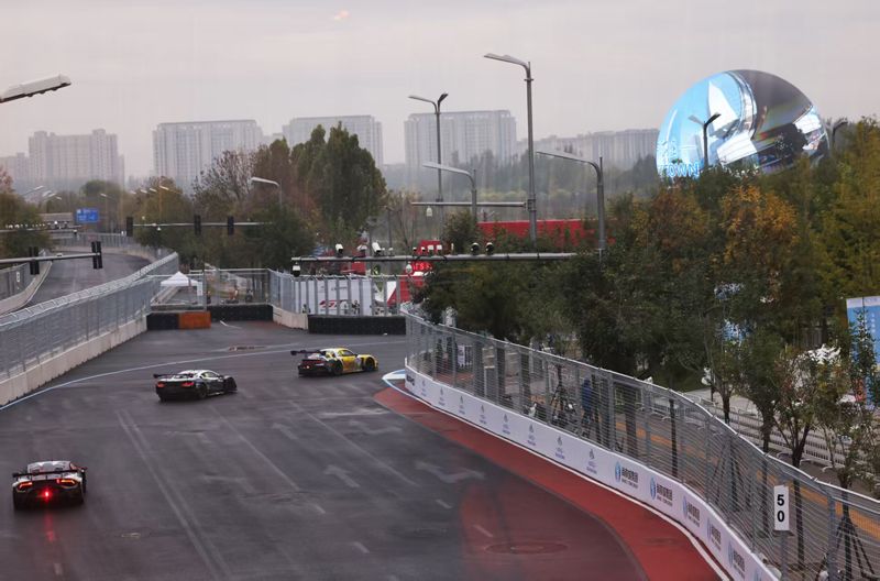 10月17日,2025GT世界挑战赛亚洲杯收官战在北京经济技术开发区(亦庄)通明湖区域举行,这是北京市首次迎来国际最高级别GT街道赛,也是2025年亚洲杯年度收官之战,填补了北京近十年国际顶级汽车赛事的空白。图为参赛车辆进行练习赛。