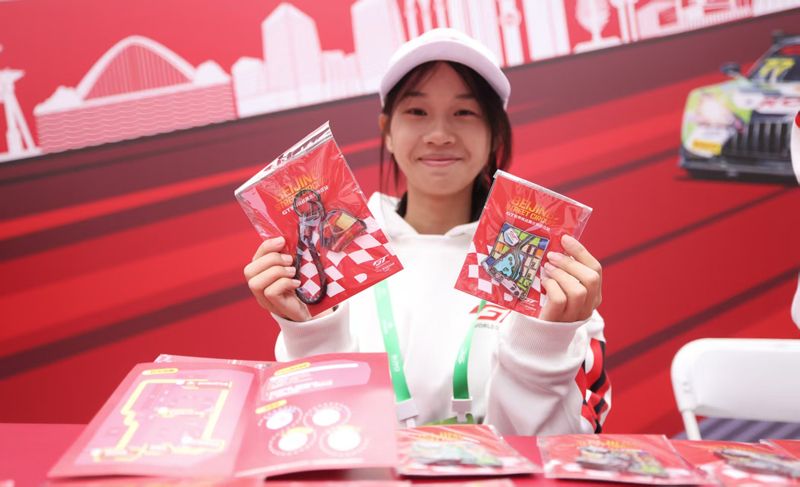 嘉年华上,工作人员展示GT世界挑战赛文创产品。
