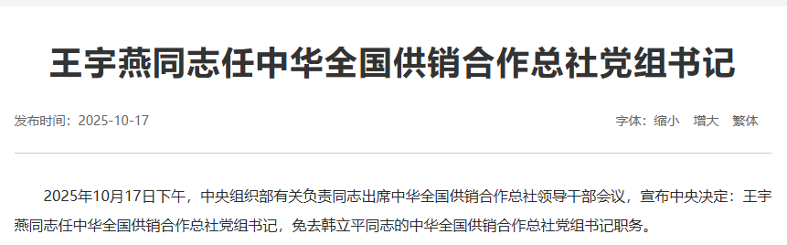 新京报讯 据中华全国供销合作总社官网消息,2025年10月17日下午,中央组织部有关负责同志出席中华全国供销合作总社领导干部会议,宣布中央决定:王宇燕同志任中华全国供销合作总社党组书记,免去韩立平同志的中华全国供销合作总社党组书记职务。