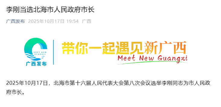 新京报讯 据广西发布微信公众号消息,2025年10月17日,北海市第十六届人民代表大会第八次会议选举李刚同志为市人民政府市长。