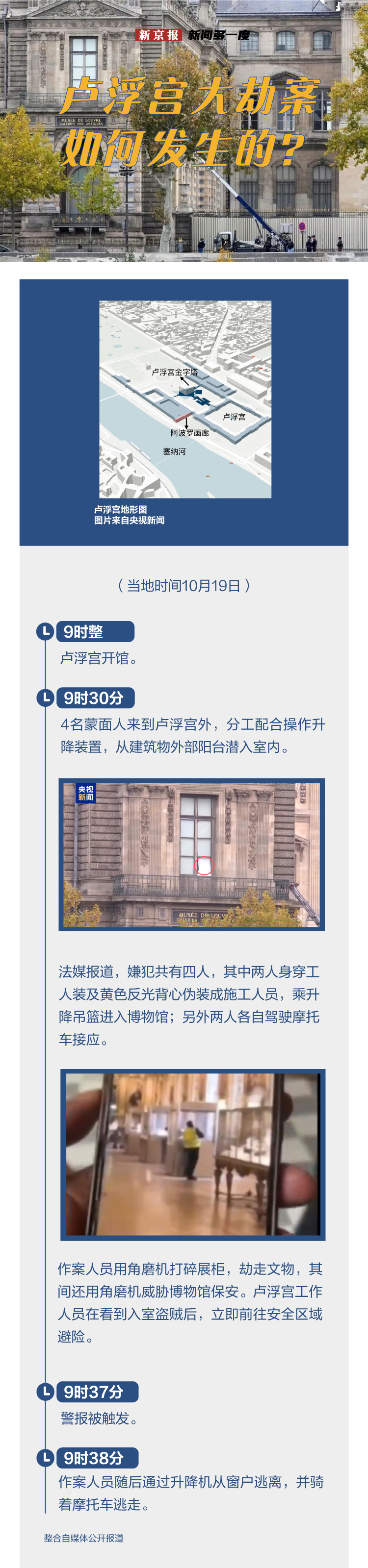 法国媒体援引警方调查初步线索及卢浮宫内部人士消息,当天清晨,数名蒙面嫌犯从塞纳河一侧施工区闯入巴黎卢浮宫,利用升降电梯进入阿波罗画廊展区,打碎玻璃后盗走多件藏品。