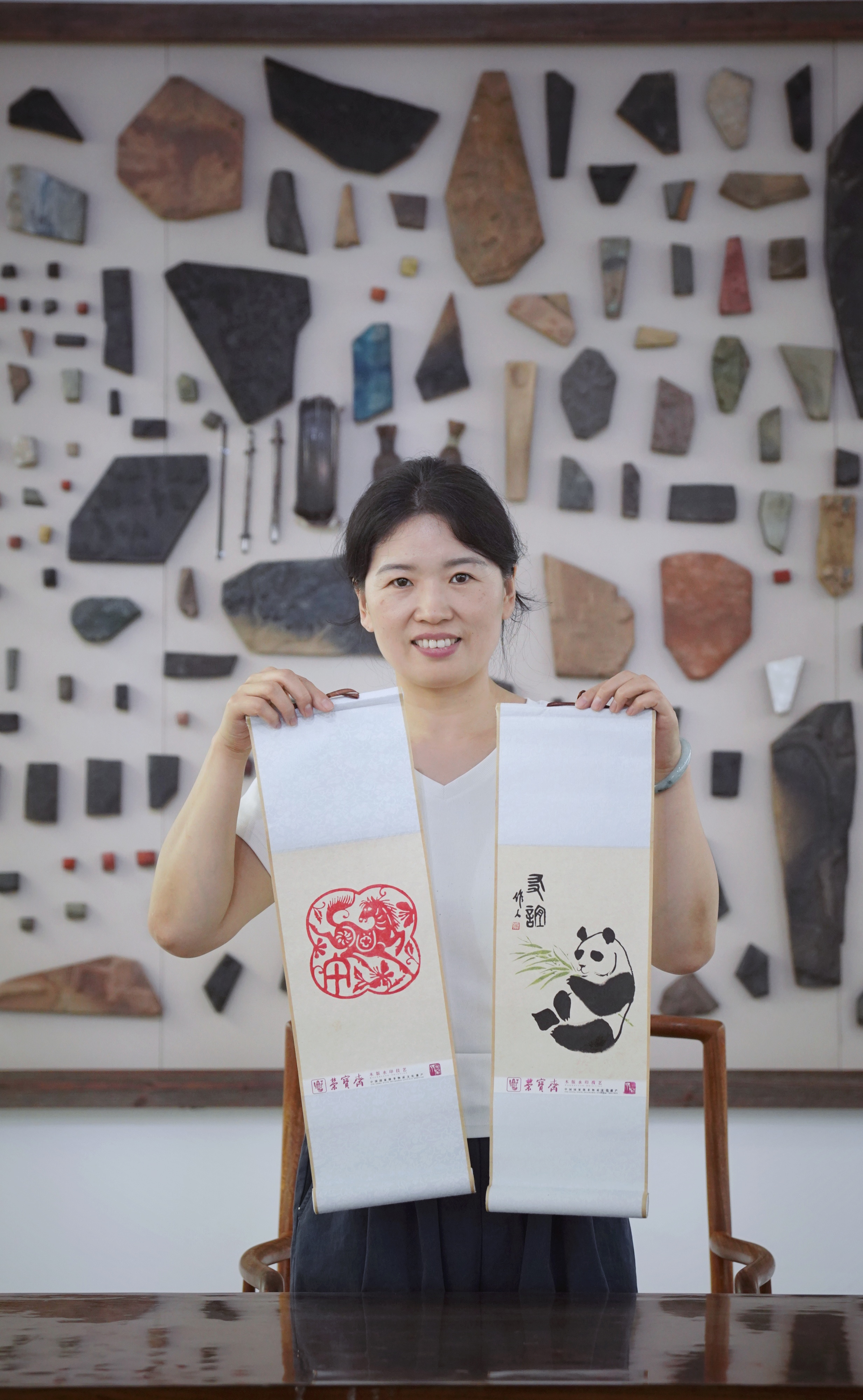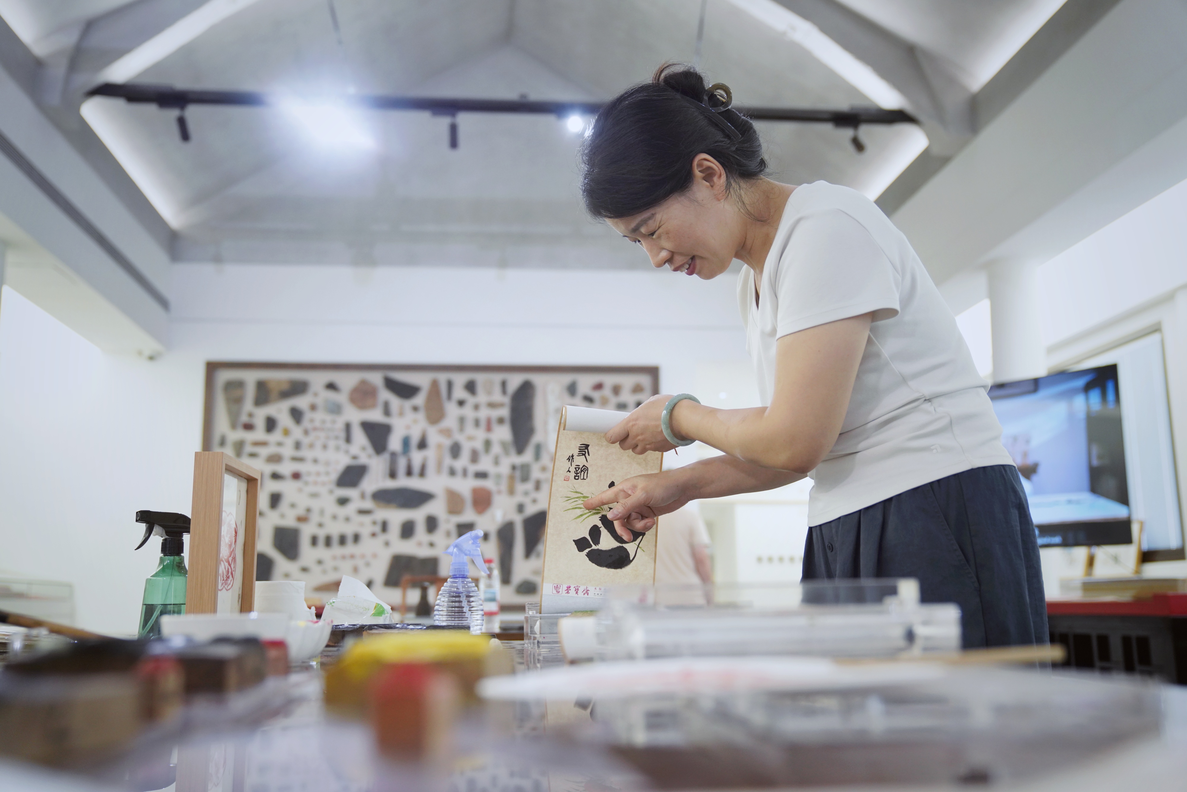 在荣宝斋工艺坊二楼的体验场地,画家吴作人的《熊猫》图被拆解成四套手掌大小的雕版,一套勾勒出熊猫的轮廓线条、一套雕刻出熊猫的四肢和五官,一套雕刻的是它手中的竹子,一套是作者的图章。体验者将四套雕版涂上黑、绿等颜料,并依次固定在相应位置,砑印在卷轴上,一幅精巧的名家画作“翻印图”便印制好了。就在刚刚过去的暑假,不少中小学生来这里印制画作,体验非遗。
