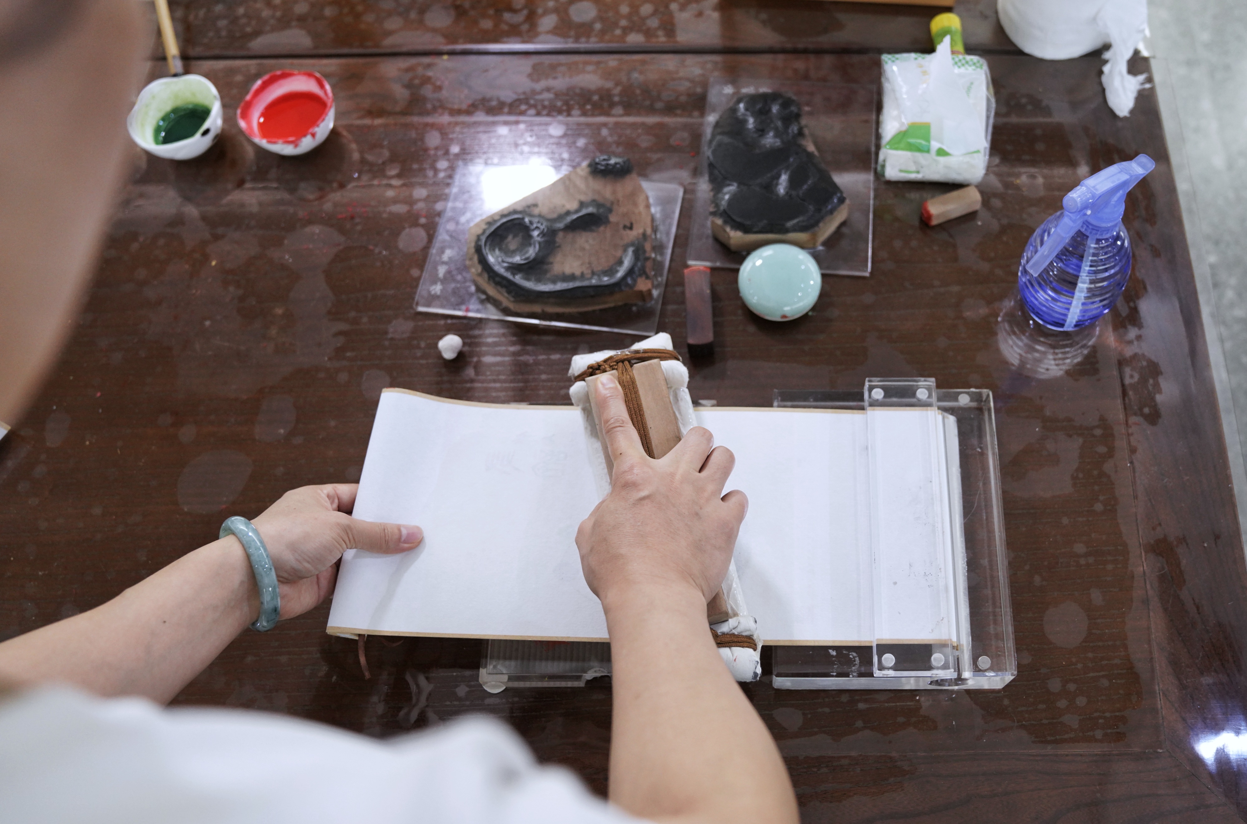 以往,技师需要将又大又重的案台拉到现场,用来固定纸张。前年,荣宝斋木版水印中心主任江书鹏发明了亚克力材质的研学装置。该装置携带轻便,可以将空白卷轴固定在卡槽中,体验者进行多轮砑印时,确保卷轴位置不变。