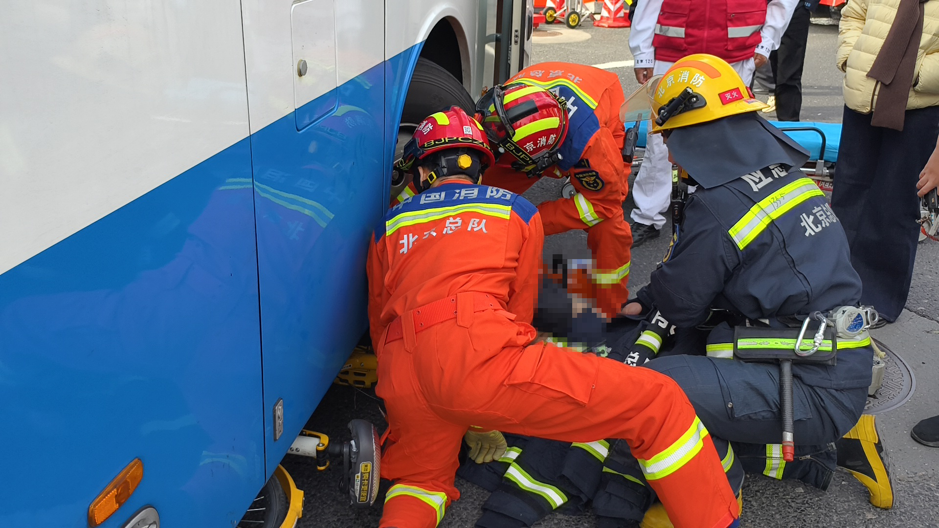新京报讯(记者张静姝)10月18日13时16分,东城区消防救援支队前门消防救援站接到调度命令,辖区发生交通事故,一人被卷入大巴车底急需救援,消防救援站立即调派救援力量赶赴现场紧急处置,成功将被困人员解救并送上救护车。