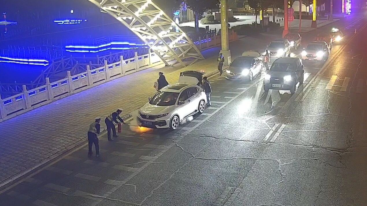 车辆行驶中突然着火,民警扛起灭火器百米冲刺施救