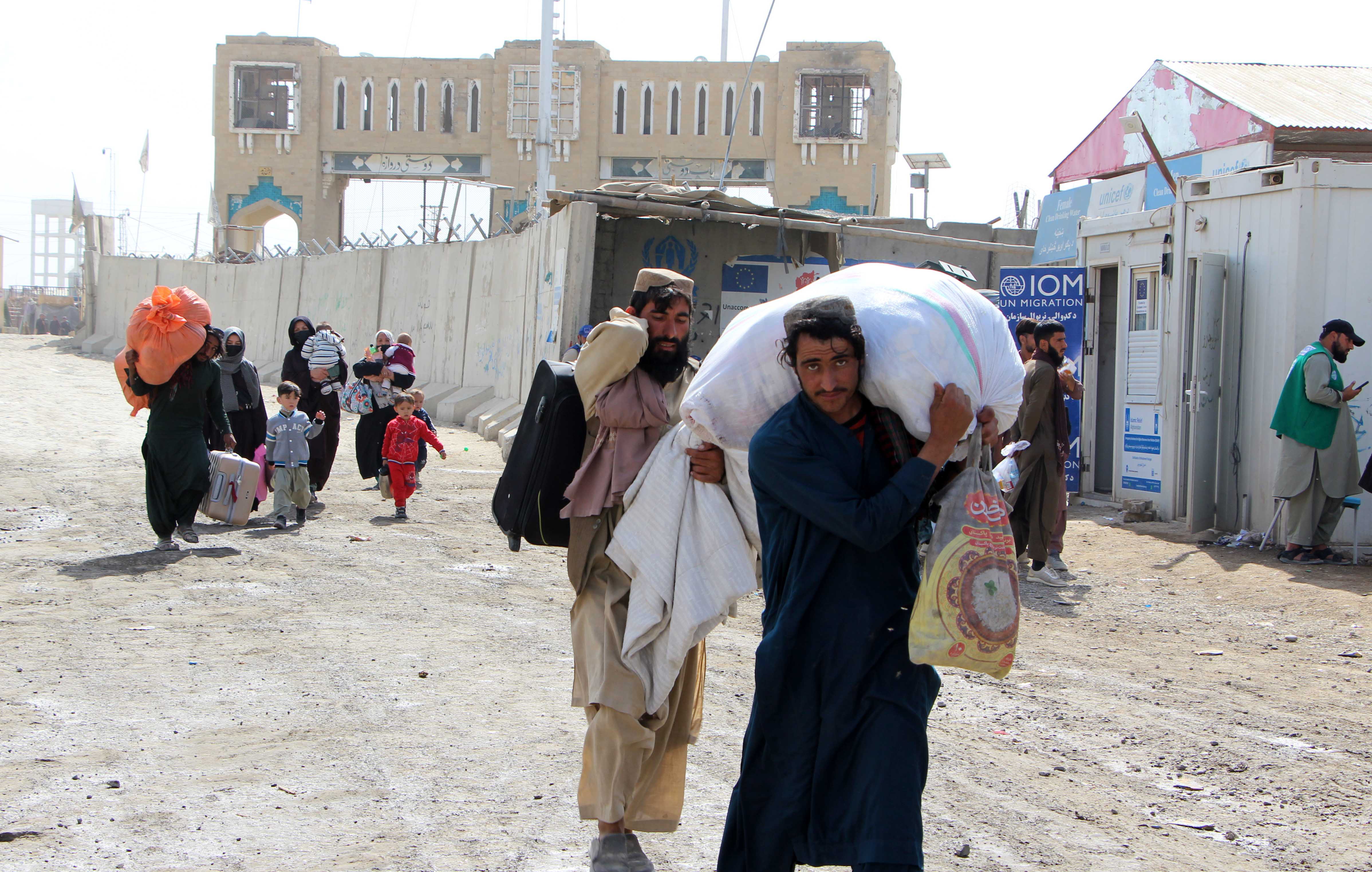 当地时间2025年10月19日,阿富汗坎大哈省斯平布尔达克,阿富汗难民携带行李在阿巴边境返乡。斯平布尔达克口岸于10月17日重新开放。图源IC