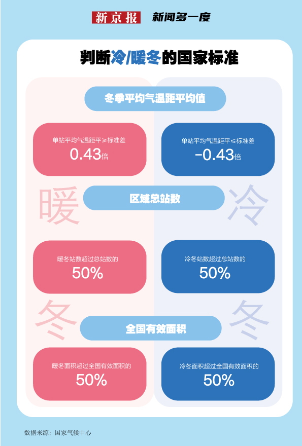 根据国家标准《暖冬等级》《冷冬等级》,冷冬/暖冬的判定都是用冬季三个月的平均气温作为判定的基本要素,通过冬季平均气温与其常年值的差值(距平)与标准差 (描述序列偏离其平均状况的统计量)来判断。