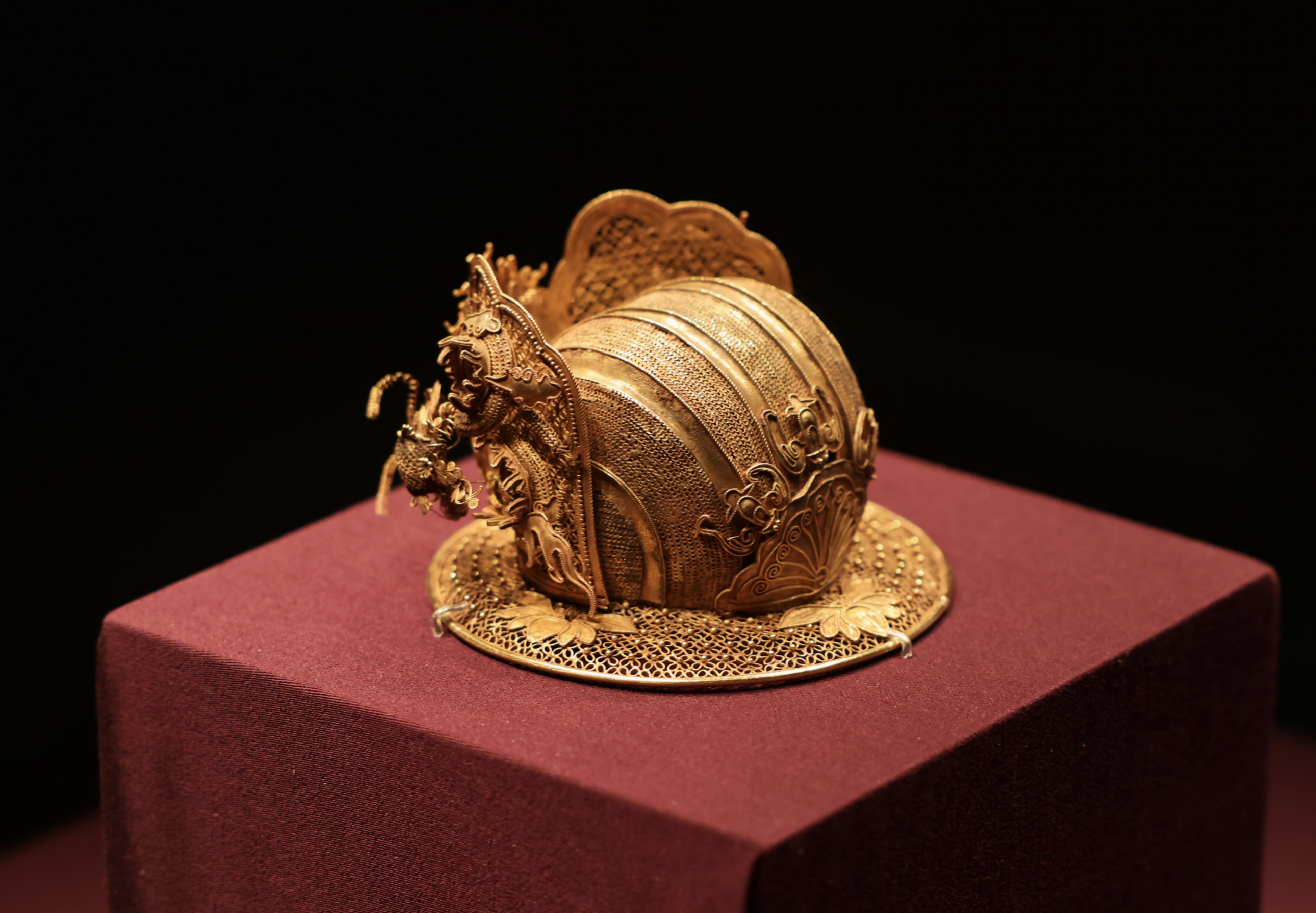 明代双龙戏珠纹梁冠。新京报记者 浦峰 摄