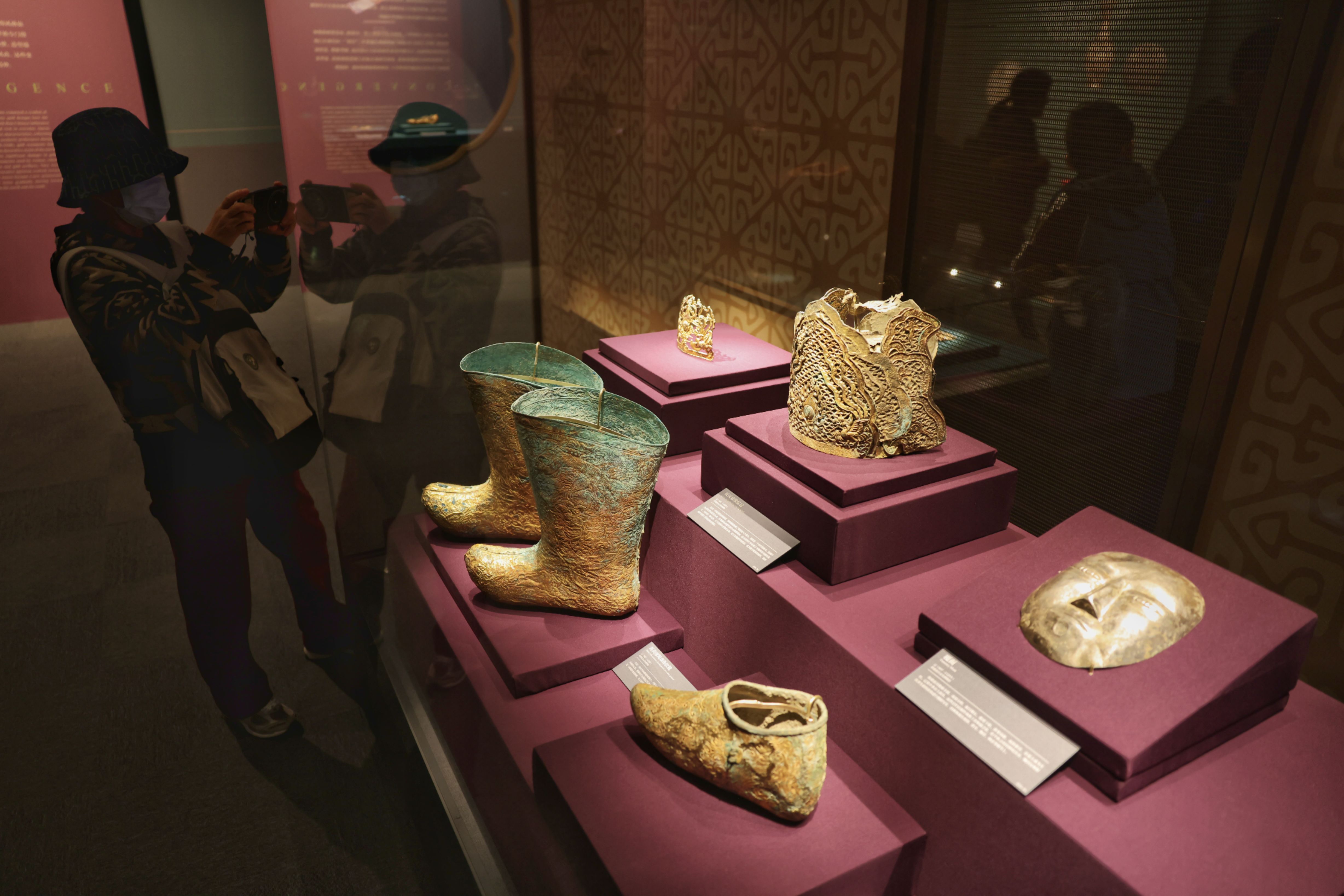 此次展品类型涵盖首饰、腰带饰件、车马饰、礼仪用具等,造型各异、工艺精湛,涵盖了从公元前15世纪直到明朝3000多年的时间跨度。第一部分“兴起:草原与早期中国”展现了黄金从欧亚草原传入中国的历程,以及商周至汉代贵族如何逐渐接受黄金饰品,形成中原与草原之间频繁互动的物质纽带。