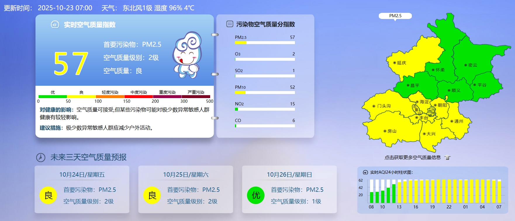 据北京市生态环境监测中心今早7时数据,目前实时空气质量指数57,空气质量良。