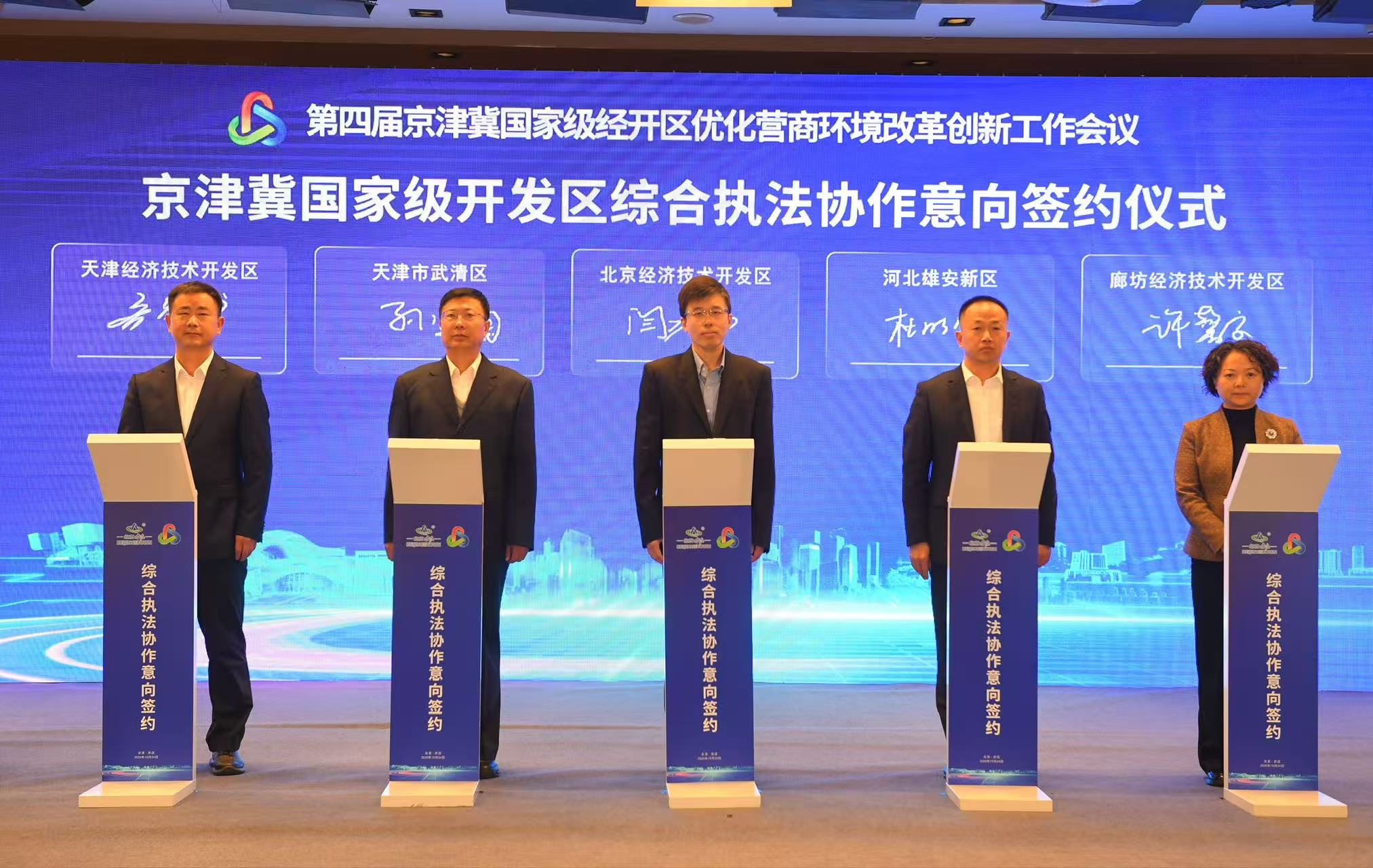 当天,北京经开区、天津经开区、天津市武清区、廊坊经开区、河北雄安新区代表还签署了《京津冀国家级开发区综合执法协作意向》,建立“信息互通、监管互动、过程互助、结果互认、经验互鉴”的执法协作新机制,打造京津冀区域一体化法治化营商环境。