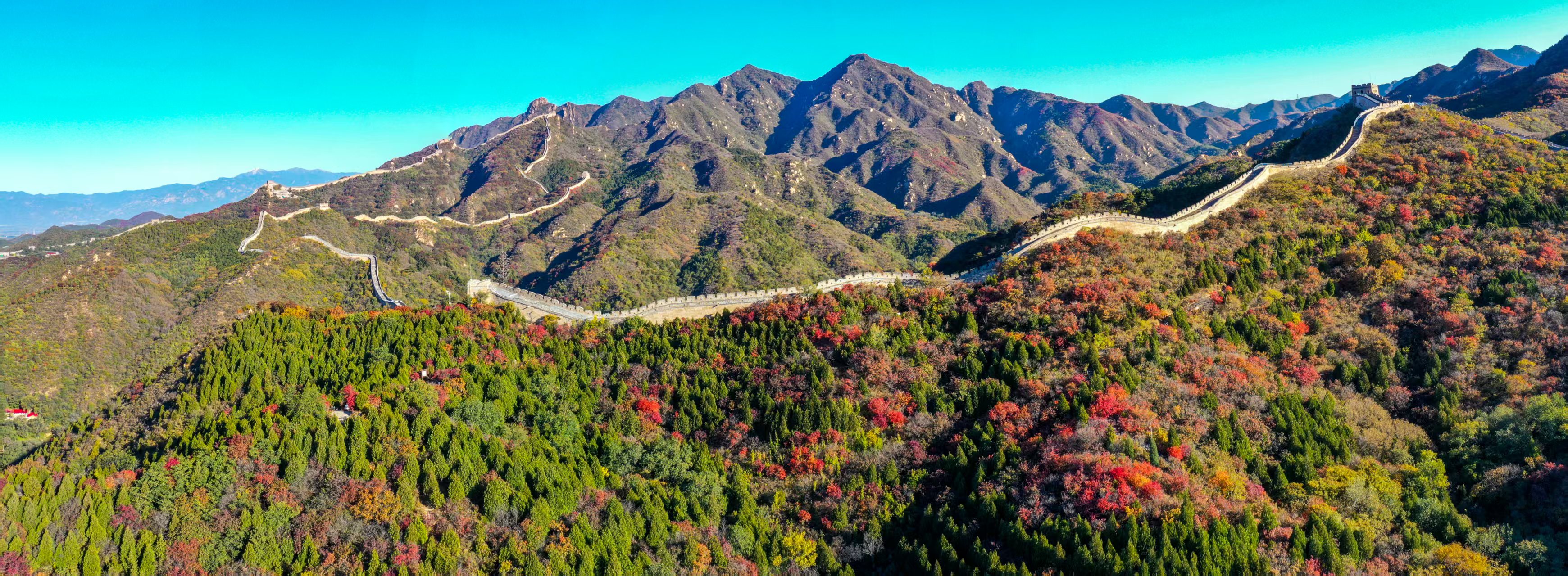 八达岭红叶岭景区因海拔较高、气候温凉,红叶变色早、色泽浓郁,极具视觉冲击力。登高远眺,可见古老长城蜿蜒于崇山峻岭之间,与漫山红叶交相辉映,刚毅与柔美并存,共同勾勒出一幅壮丽而富有诗意的秋日长卷。因树种与海拔差异,红叶呈现橙红、猩红至深紫红的自然渐变,宛如天然调色盘。
