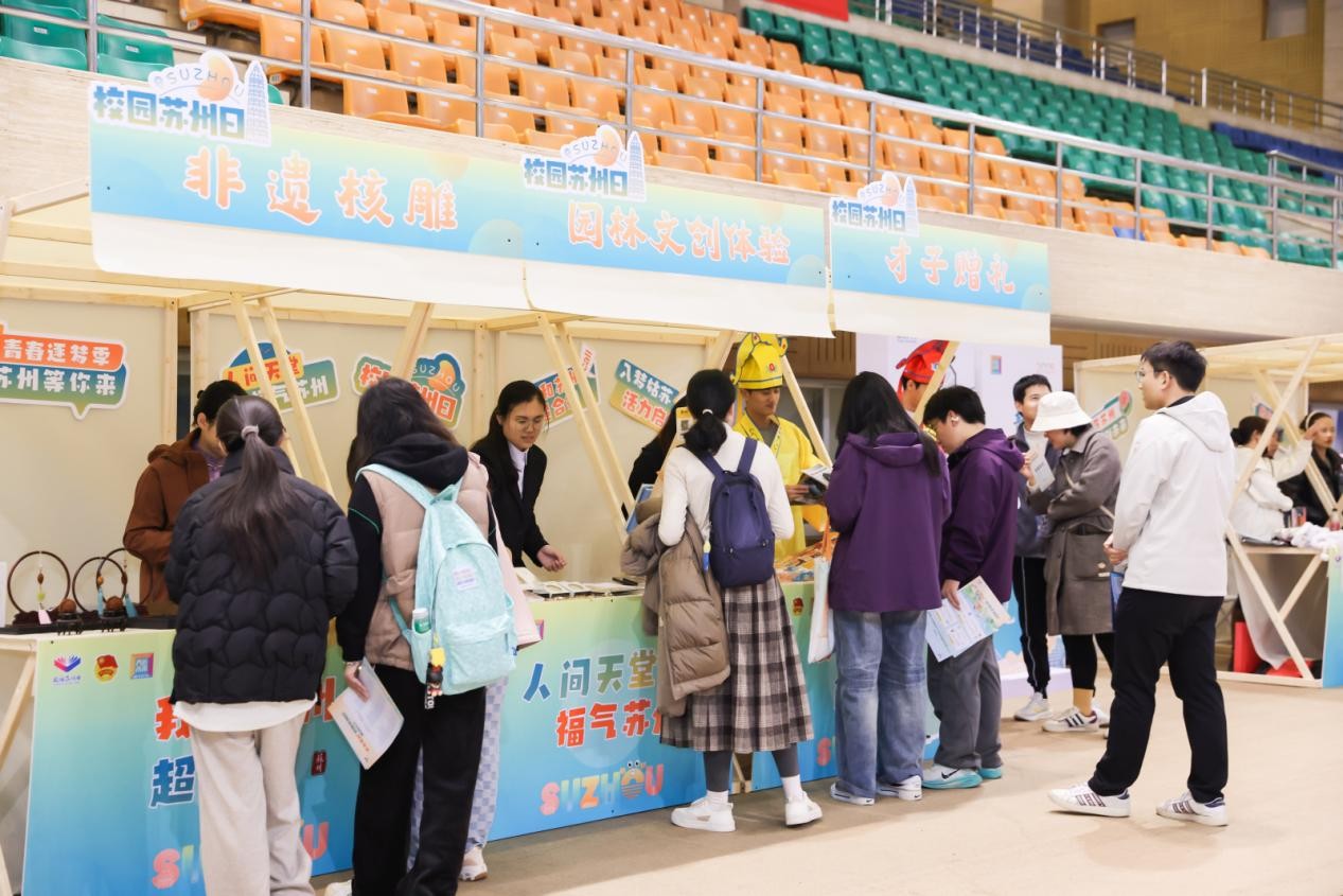 与招聘区的紧张氛围不同,一旁的青春市集充满了江南韵味。同学们沉浸式体验昆曲换装、近距离接触苏绣核雕、挑战“四大才子”趣味问答,丰富多元的活动吸引了大批青年学子现场体验。