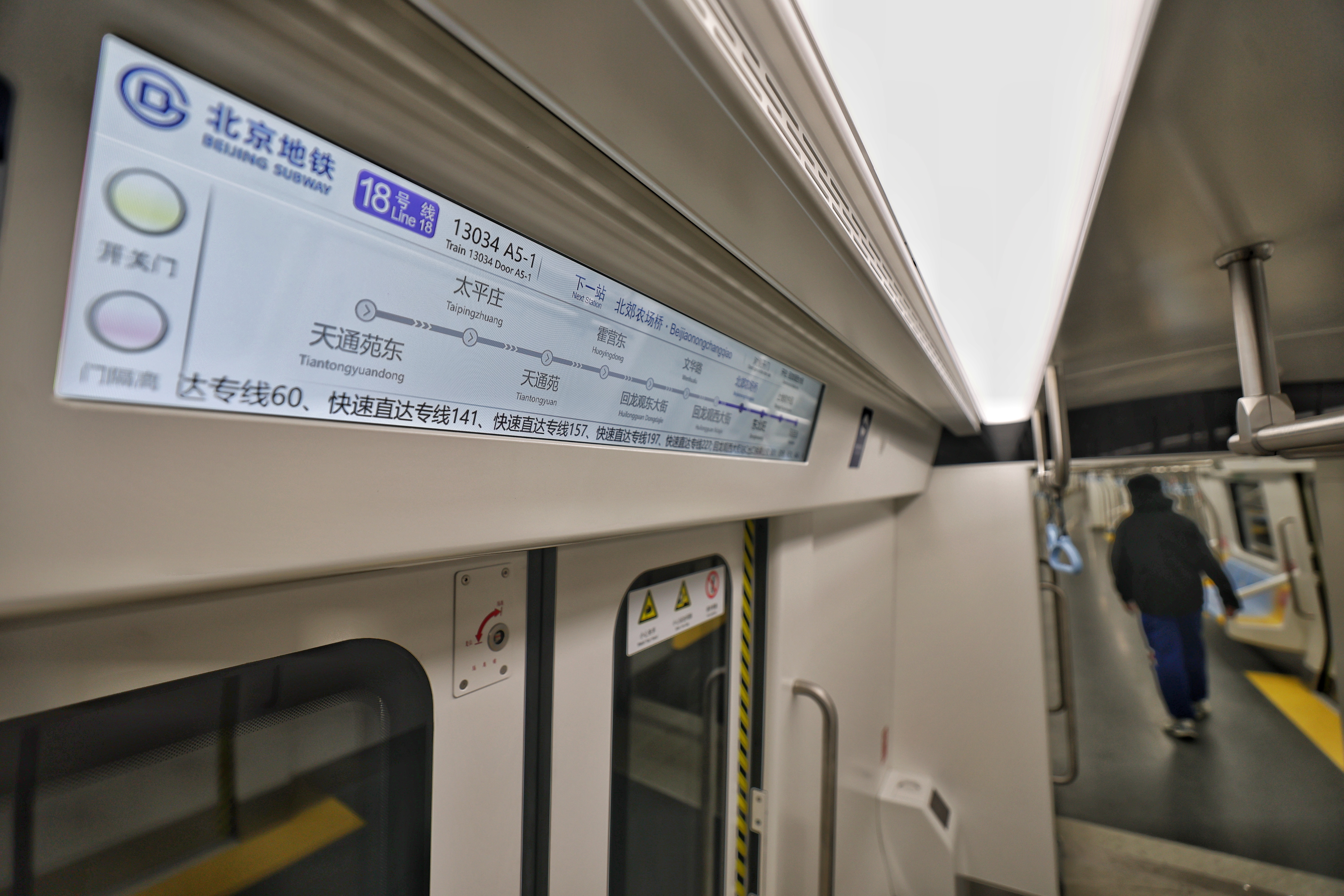 地铁18号线车厢内的电子屏。新京报记者 陶冉 摄