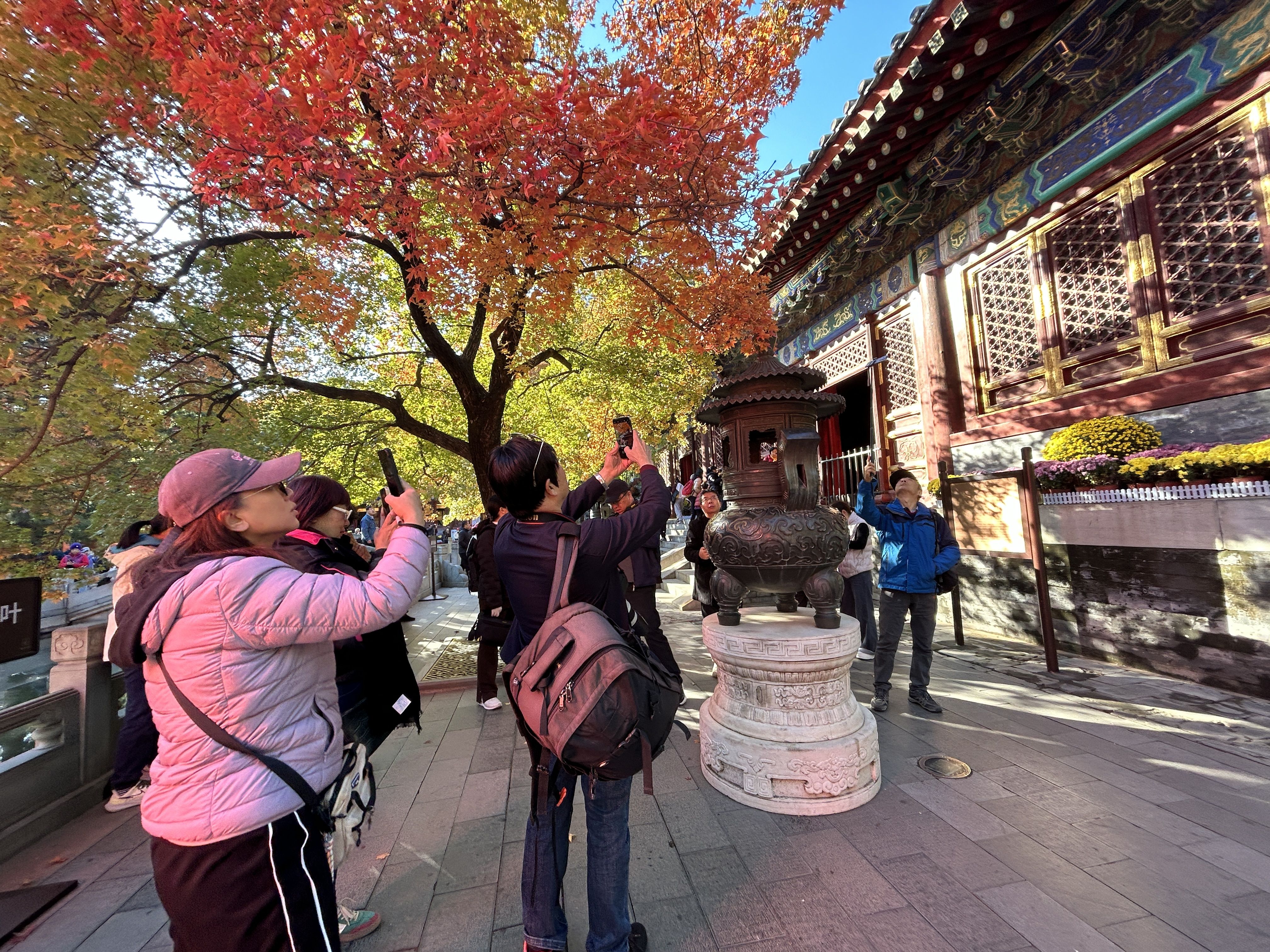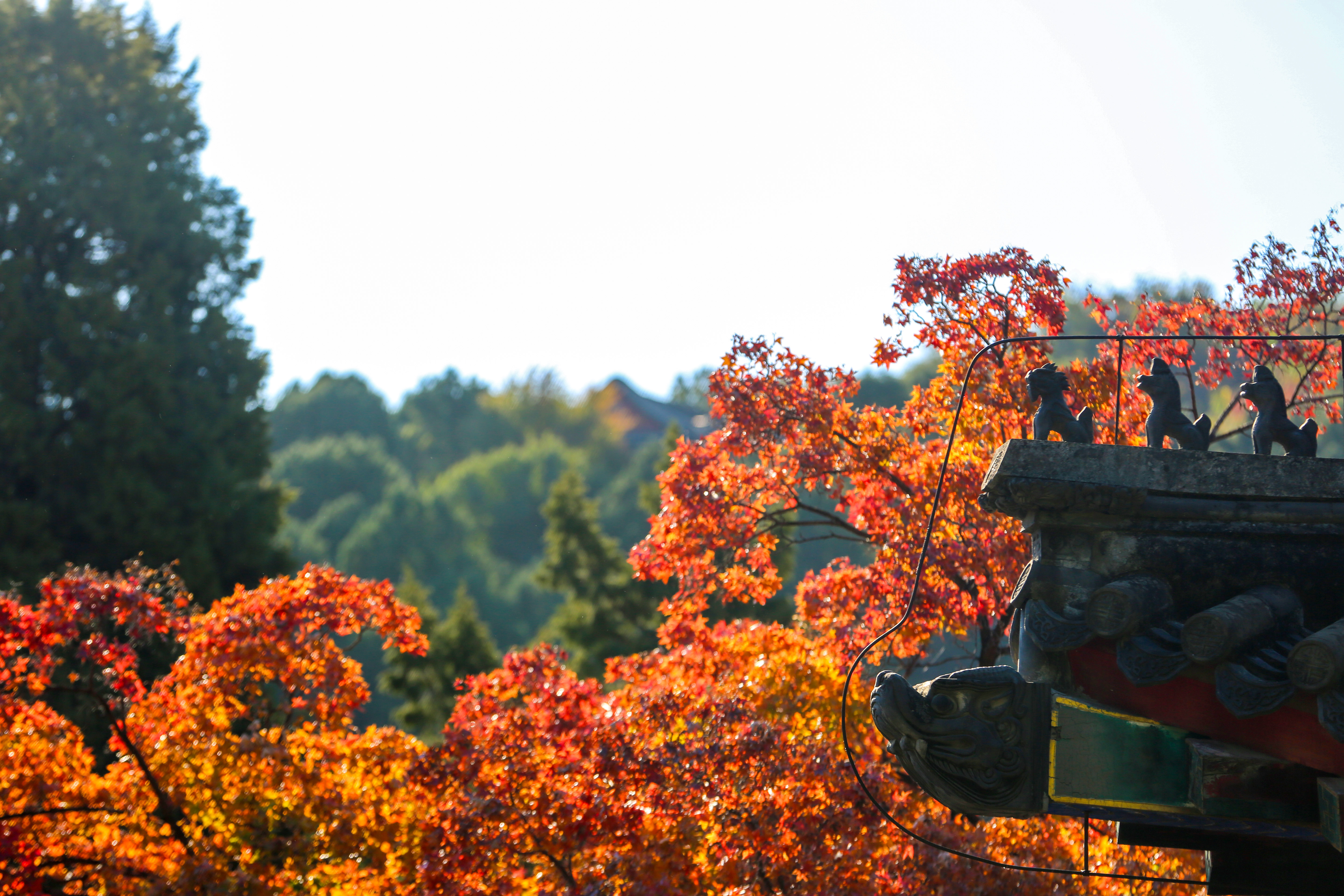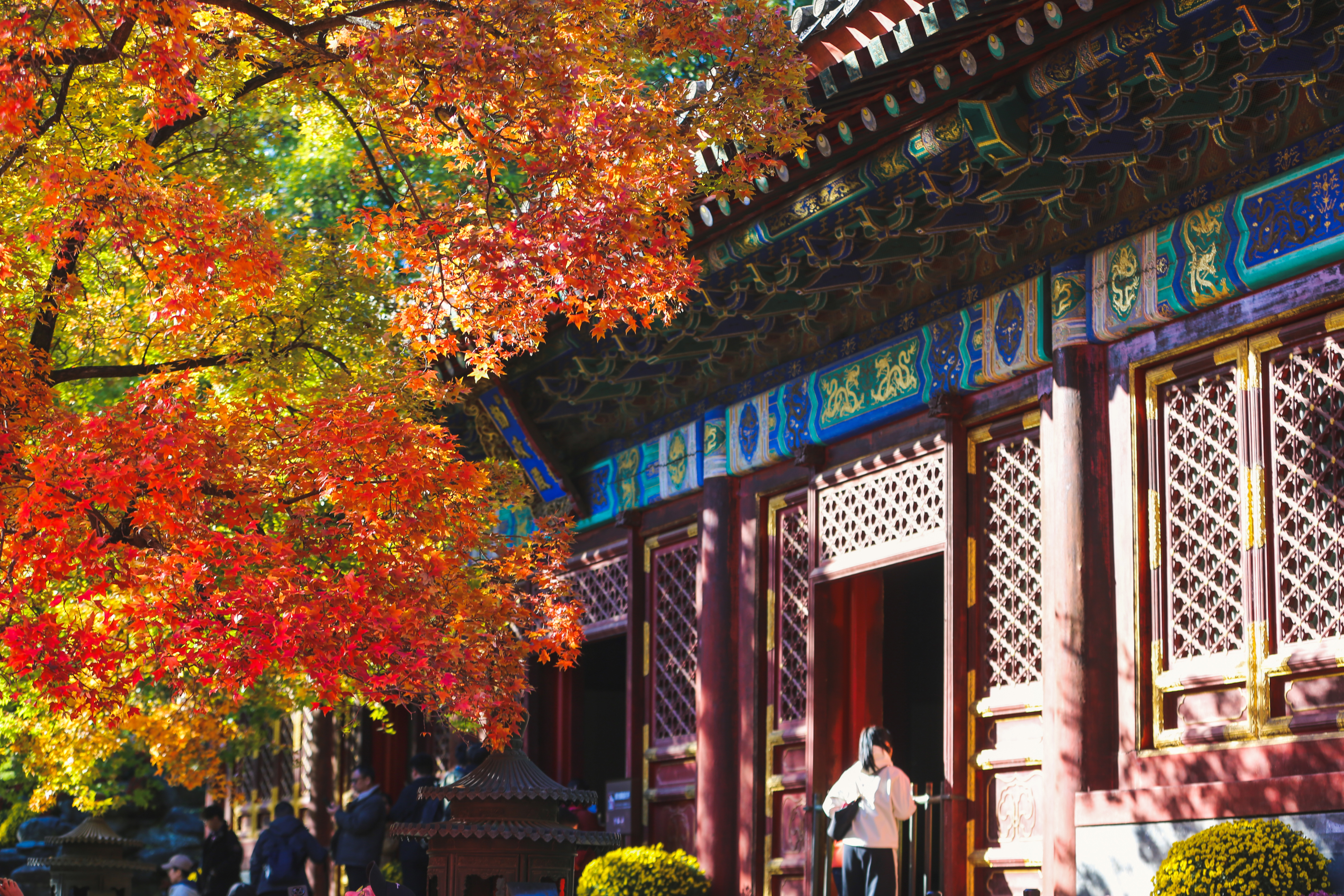勤政殿:公园的标志性建筑,静宜园二十八景之首勤政殿前的元宝枫是香山红叶的“消息树”,它们的变色预示着红叶已进入最佳观赏期。橙红的叶片与皇家殿宇彩画、香炉、窗楞相映成趣,尽显古韵秋华,是拍摄建筑与红叶完美结合的经典机位。