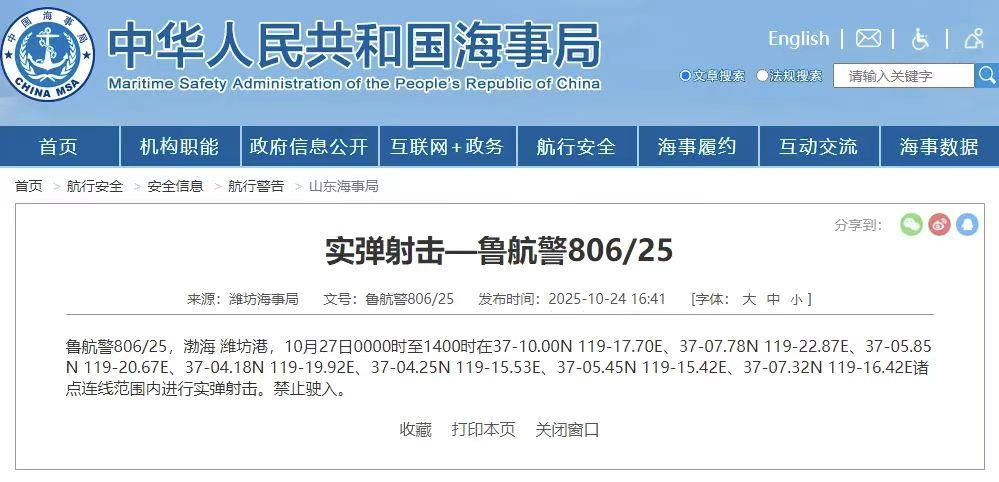 据央视新闻消息,据中国海事局网站消息,潍坊海事局发布航行警告,10月27日0时至14时,渤海潍坊港部分海域进行实弹射击,禁止驶入。