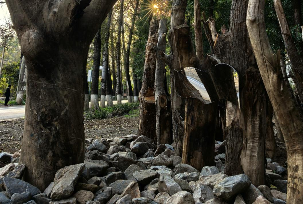 《水线:我在镇罗营》源自村民和艺术家们的集体创作,它前端9根最粗的树桩收集自镇罗营受灾严重的9个村子,每一根都有它的故事。第一排最粗的那根,曾经挡在关上村东边入口,加上碎石、泥沙和小树枝,形成了一道“墙”,将当时汹涌而至的洪水和泥石流的大部分挡住,导流到旁边河道里,减缓了村里水线的快速上升。救援人员说,那根树桩给救援创造了时间,至少救了村里东边低地的十几栋房屋和数十位村民。