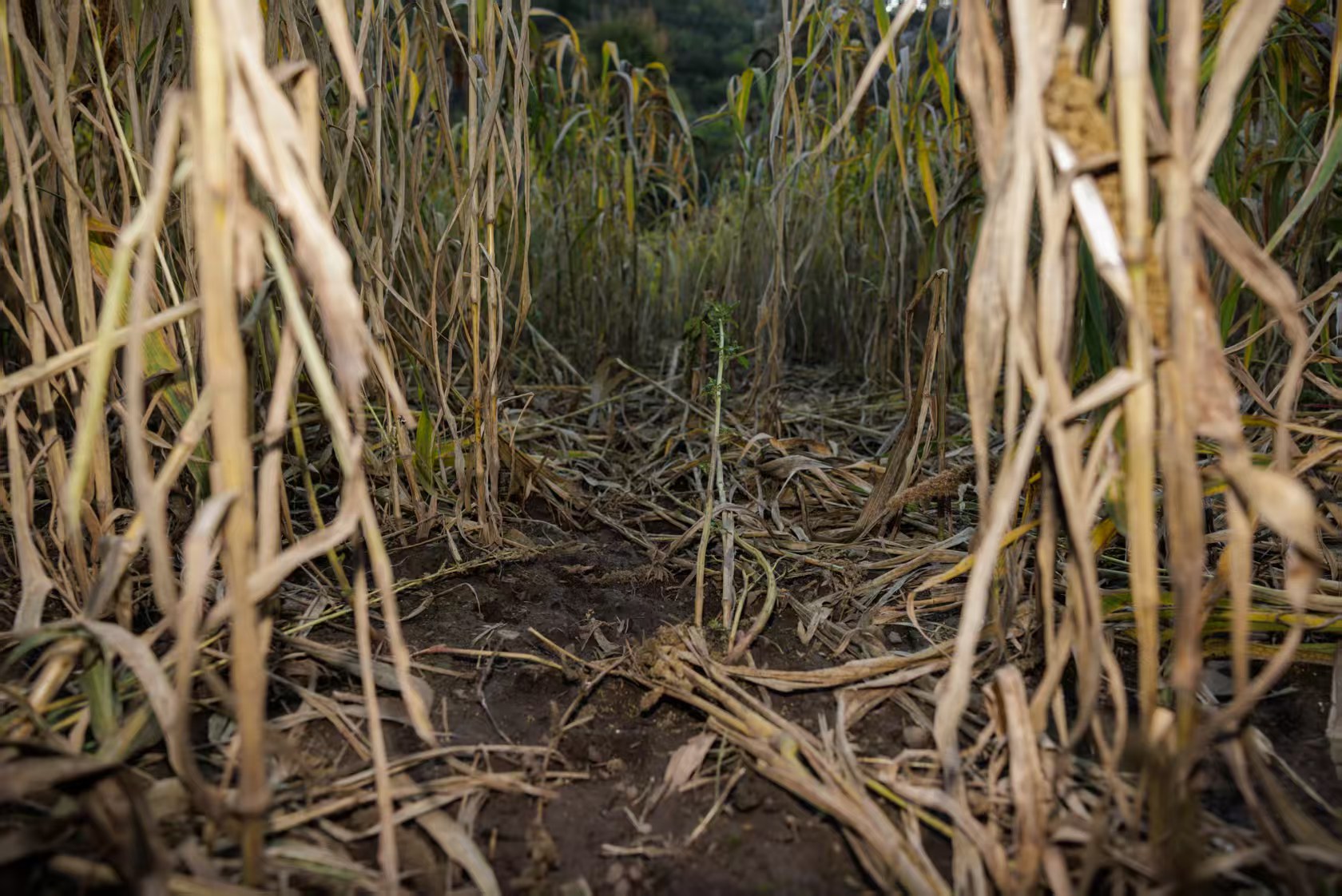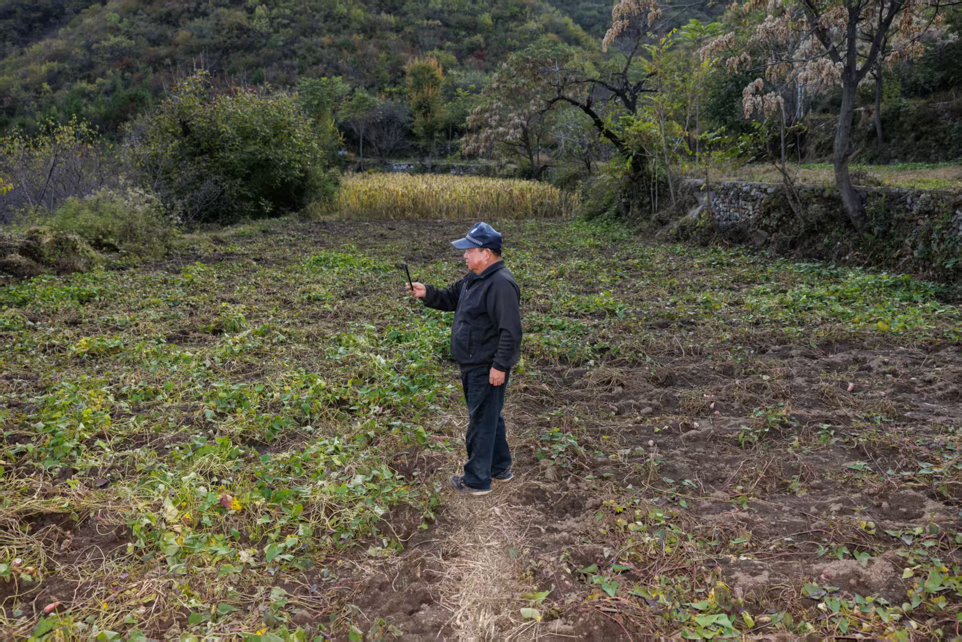 王进军在野猪拱过的红薯田中拍照。新京报记者 王子诚 摄