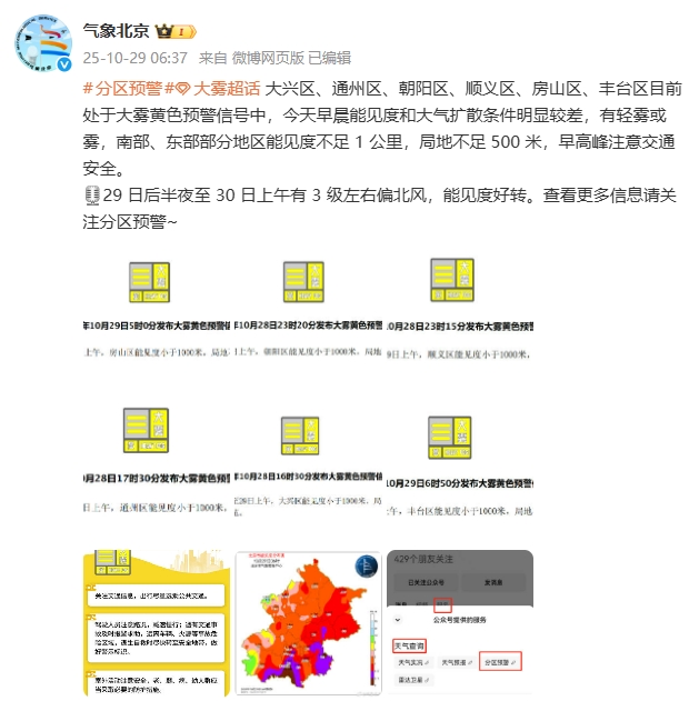 新京报讯 据@气象北京消息,大兴区、通州区、朝阳区、顺义区、房山区、丰台区目前处于大雾黄色预警信号中,今天早晨能见度和大气扩散条件明显较差,有轻雾或雾,南部、东部部分地区能见度不足 1 公里,局地不足 500 米,早高峰注意交通安全。
