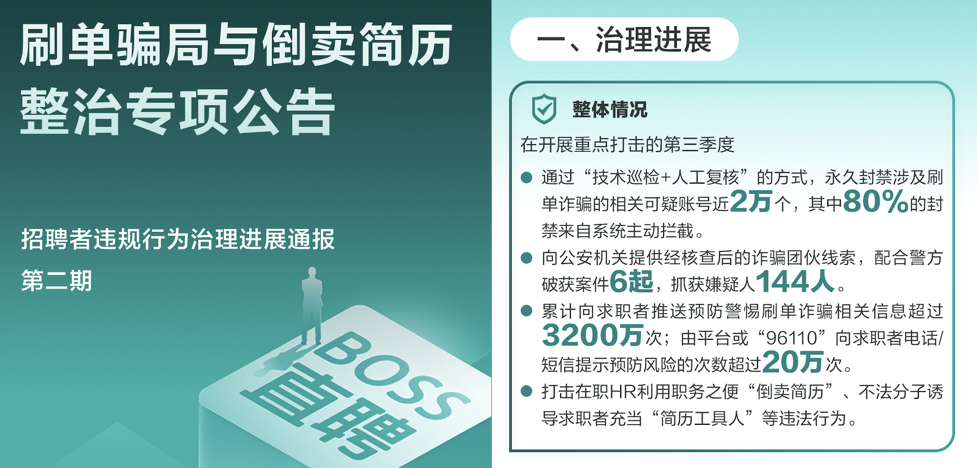 10月29日,BOSS直聘发布《刷单骗局与倒卖简历整治专项公告》,披露了针对诱导求职者参与“网络刷单”、骗取钱款及倒卖简历等违法行为的治理进展与典型违法案例。