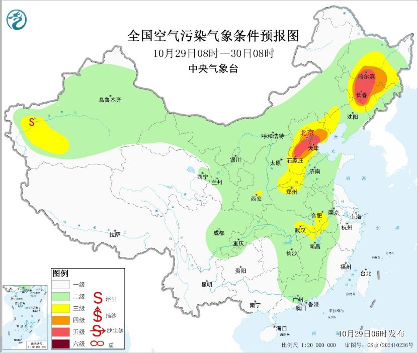 此外,10月29日,华北中南部、黄淮西部大气扩散条件转差,有轻至中度霾,部分地区有重度霾。30日,受冷空气影响,上述地区霾天气自北向南逐渐减弱或消散。