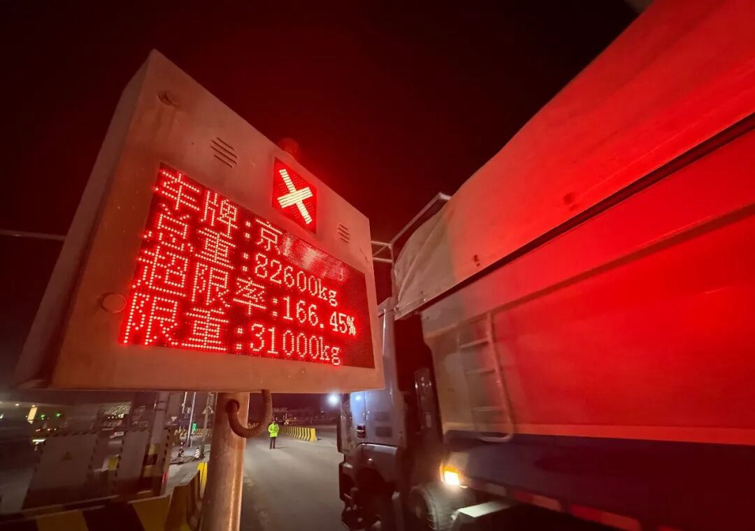 白庙收费站,违法大货车称重后显示超载率已达166.45%。新京报记者 王贵彬 摄