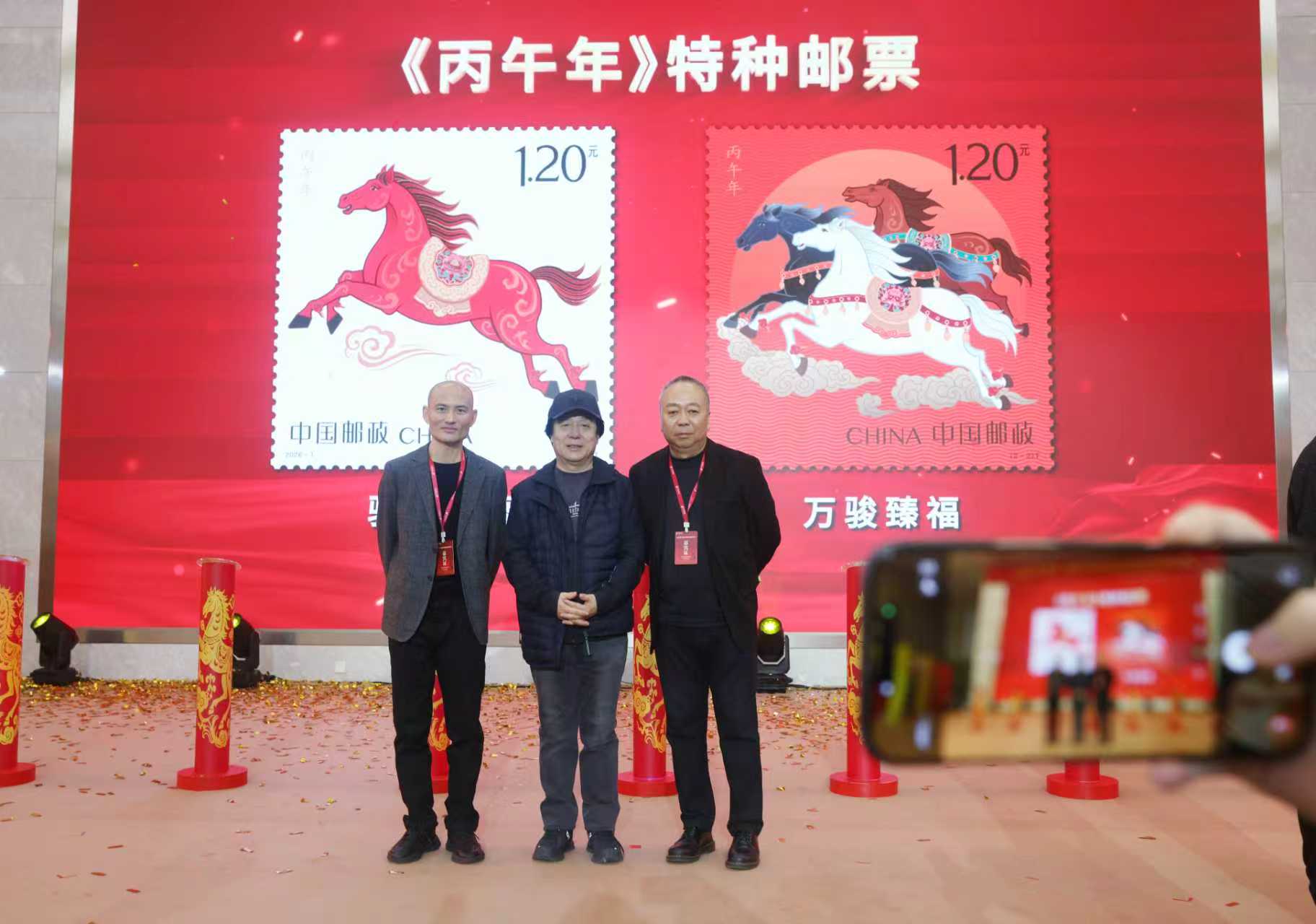 《丙午年》特种邮票由王红卫(右一)、赵恩重(左一)设计。新京报记者 李木易 摄