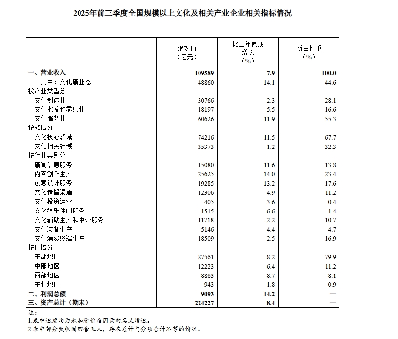 新京报讯 据国家统计局消息,据对全国8.1万家规模以上文化及相关产业企业(以下简称“文化企业”)调查,2025年前三季度,文化企业实现营业收入109589亿元,按可比口径计算(详见附注2),比上年同期增长7.9%[1]。其中,文化新业态特征较为明显的16个行业小类[2]实现营业收入48860亿元,比上年同期增长14.1%,快于全部规模以上文化企业6.2个百分点。