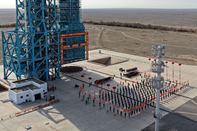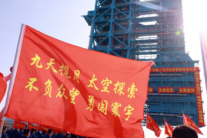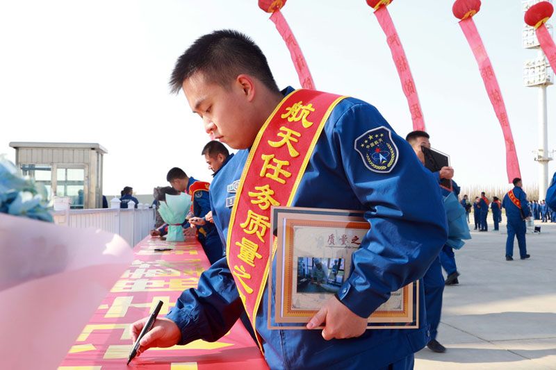 10月22日,神舟二十一号船箭组合体垂直转运前一天,百余名科技人员代表在发射塔架下举行神舟二十一号载人飞行决战动员誓师大会。大会结束后,科技人员高玮说:“现在感觉特别有激情,下一步要完成好自己的任务,保障各项工作顺利进行。”