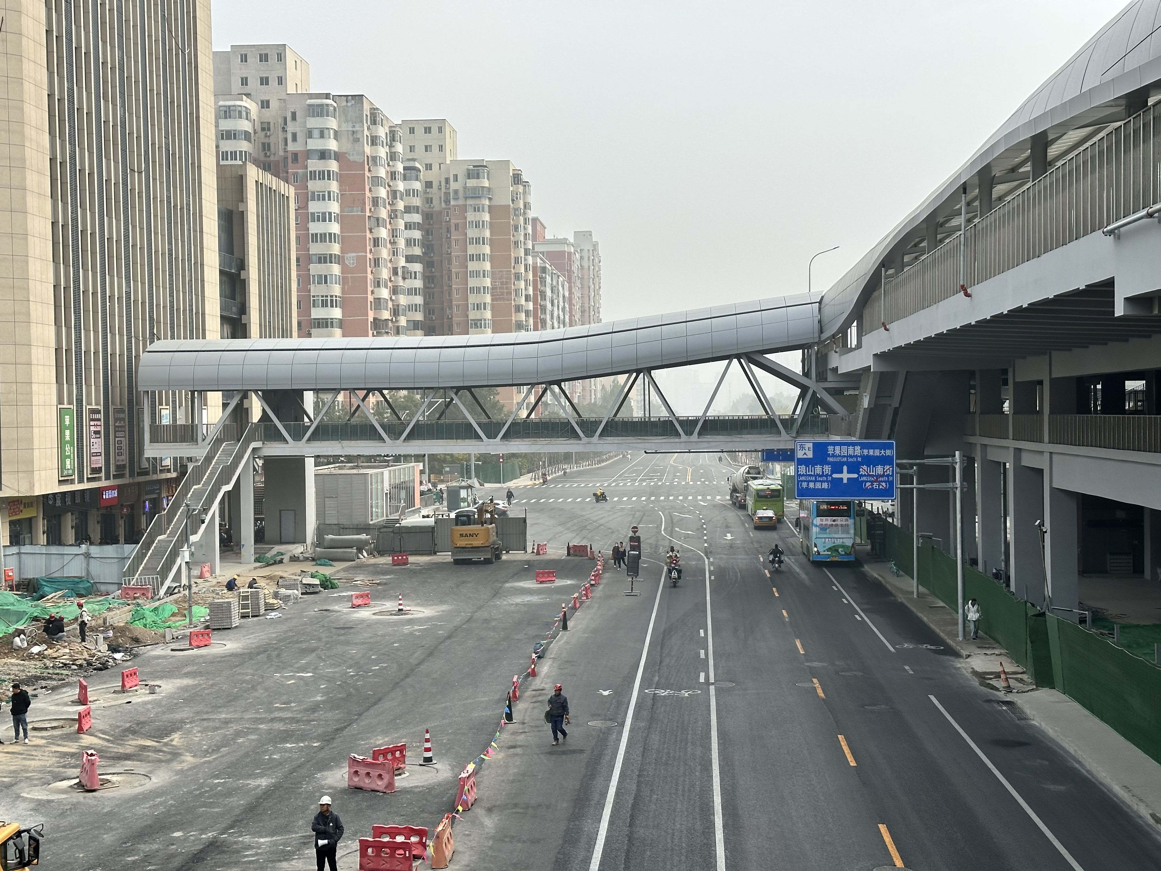 苹果园综合交通枢纽南北横跨阜石路、苹果园南路、苹果园路等三条道路,空中用连廊衔接。新京报记者 王贵彬 摄