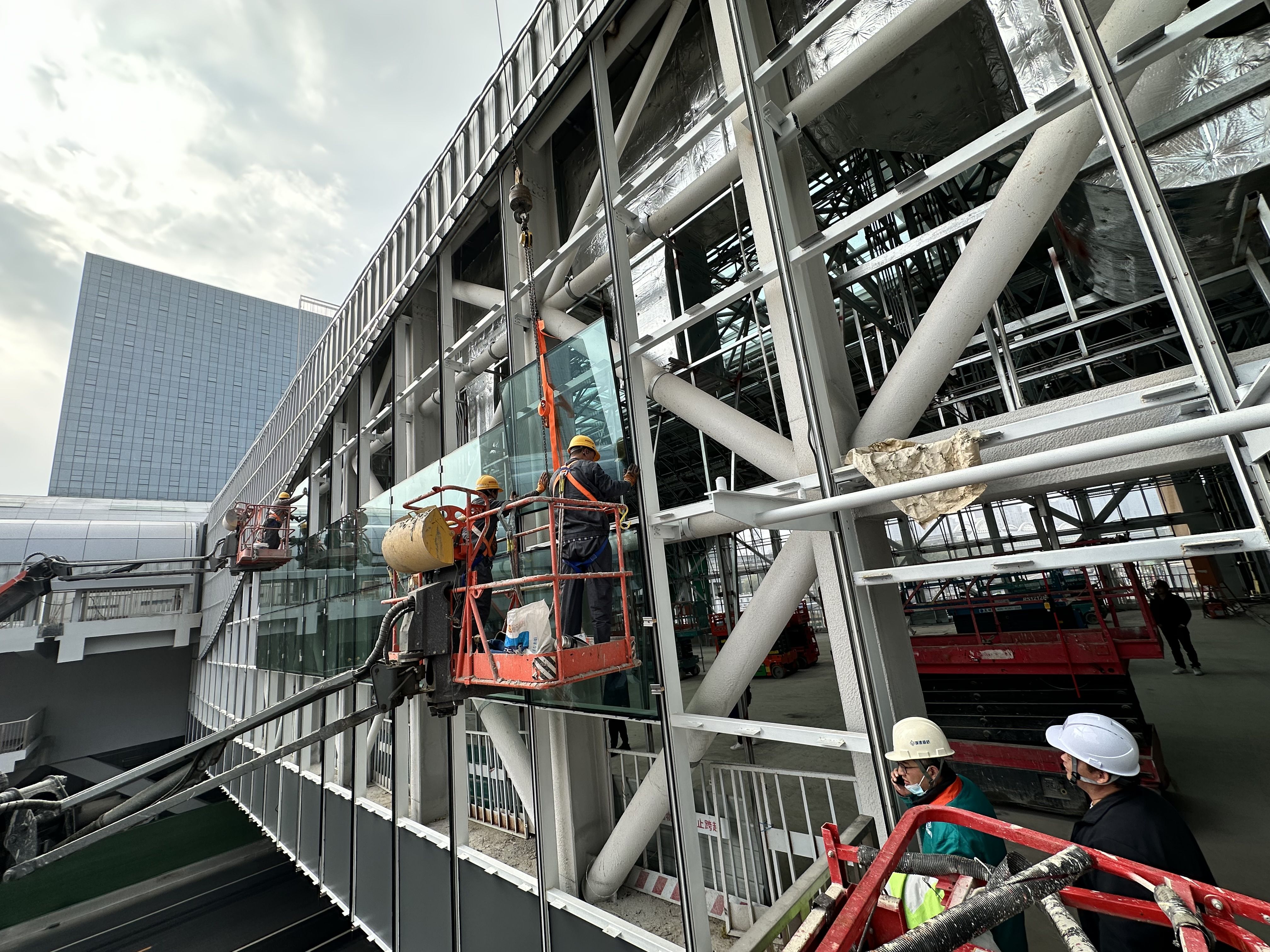 10月30日上午,苹果园综合交通枢纽内,工人正在安装换乘廊道内的玻璃外墙。新京报记者 王贵彬 摄