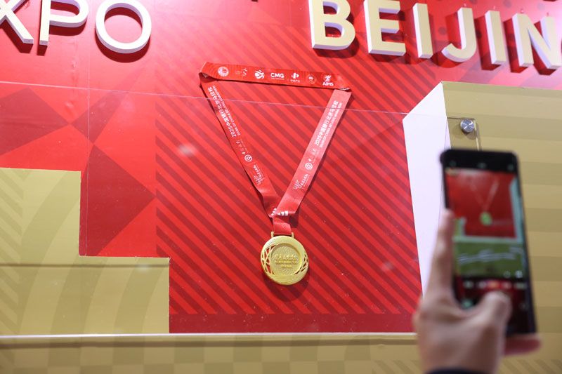 2025北京·马拉松博览会于10月30日至11月1日在中国国际展览中心(朝阳馆)举办,首次对公众免费开放,展览面积达20000平方米,包含选手领物、互动体验与体育文化展示等多元内容。 图为北马45周年主题展区内的2025北马奖牌。