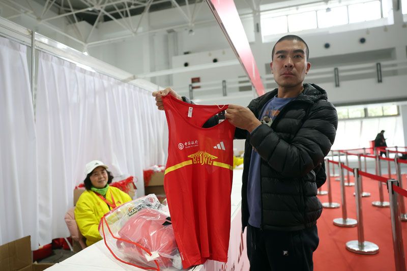 运动员领物区分红蓝双通道,普通选手与公益选手分流领取参赛包,现场提供尺码调换服务。图为运动员展示参赛服装。