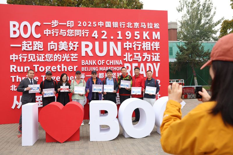 运动员在打卡处合影。
